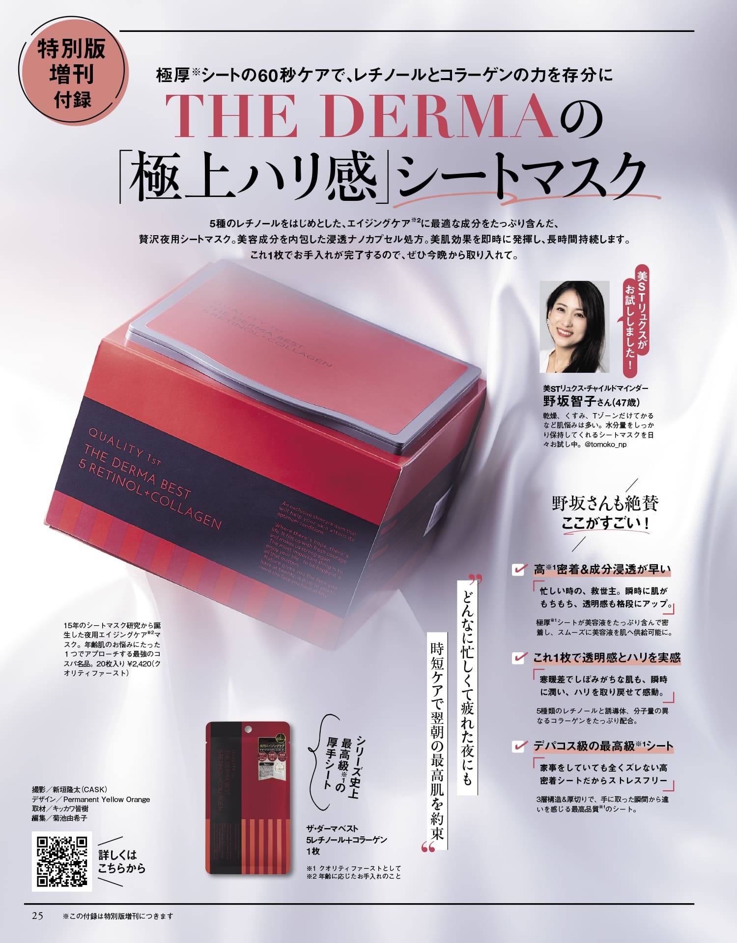 5種のレチノールをはじめとした、エイジングケアに最適な成分をたっぷり含んだ、贅沢夜用シートマスク。美容成分を内包した浸透ナノカプセル処方。美肌効果を即時に発揮し、長時間持続します。これ1枚でお手入れが完了するので、ぜひ今晩から取り入れて。ザ・ダーマベスト 5レチノール+コラーゲン 1枚