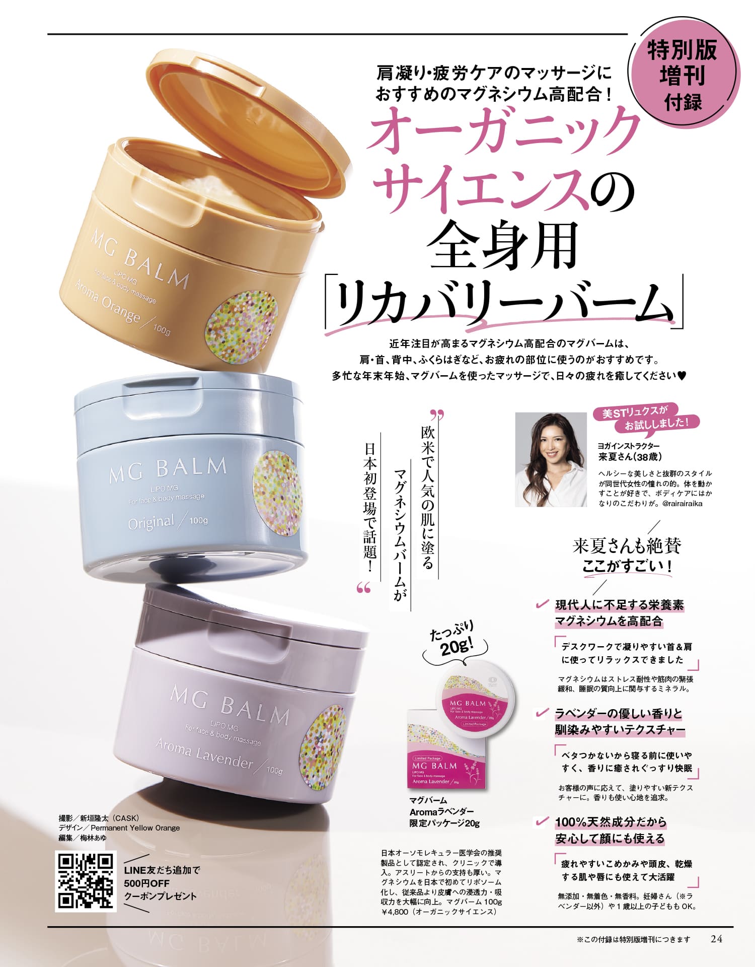 近年注目が高まるマグネシウム高配合のマグバームは、肩・首、背中、ふくらはぎなど、お疲れの部位に使うのがおすすめです。多忙な年末年始、マグバームを使ったマッサージで、日々の疲れを癒してください♡たっぷりサイズでお試しできます!マグバーム Aromaラベンダー 限定パッケージ 20g