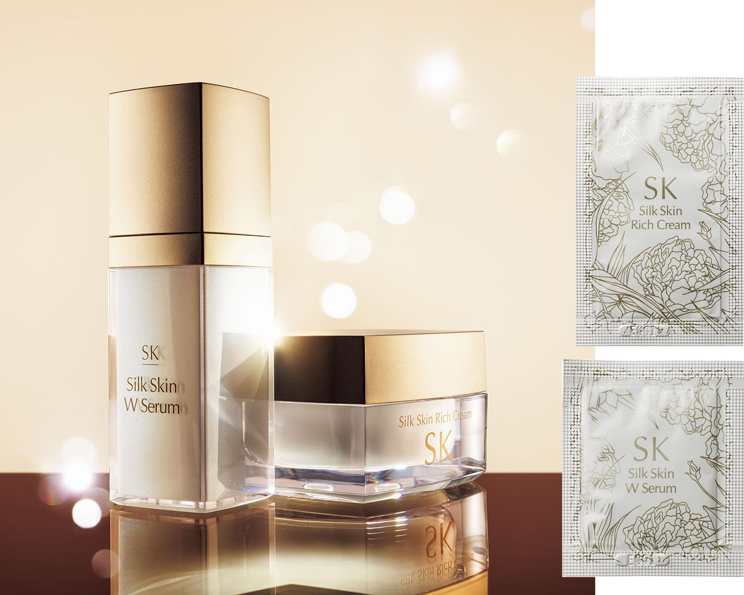 季節も朝も夜も関係ないブルーライト。このセットで朝も晩も、真冬も徹底対策を!ナイアシンアミドとトラネキサム酸のW配合で発光するような美白を追求。SKシルクスキンWセラム 0.8ml、シミとシワに徹底アプローチ。シルクスキンリッチクリーム 1.2g 各パウチ1包[ともに医薬部外品]