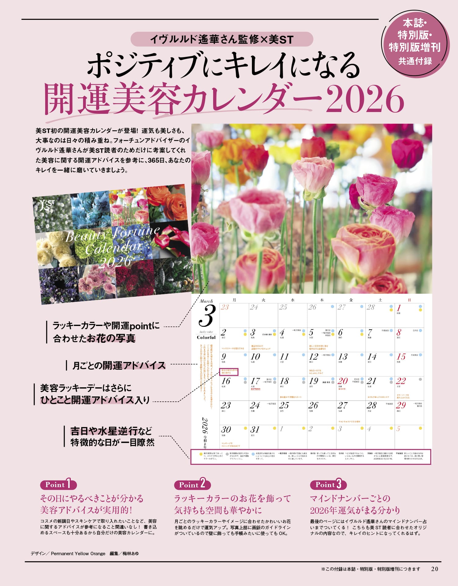 美ST初の開運美容カレンダーが登場!運気も美しさも、大事なのは日々の積み重ね。フォーチュンアドバイザーのイヴルルド遙華さんが美ST読者のためだけに考案してくれた美容に関する開運アドバイスを参考に、365日、あなたのキレイを一緒に磨いていきましょう。
