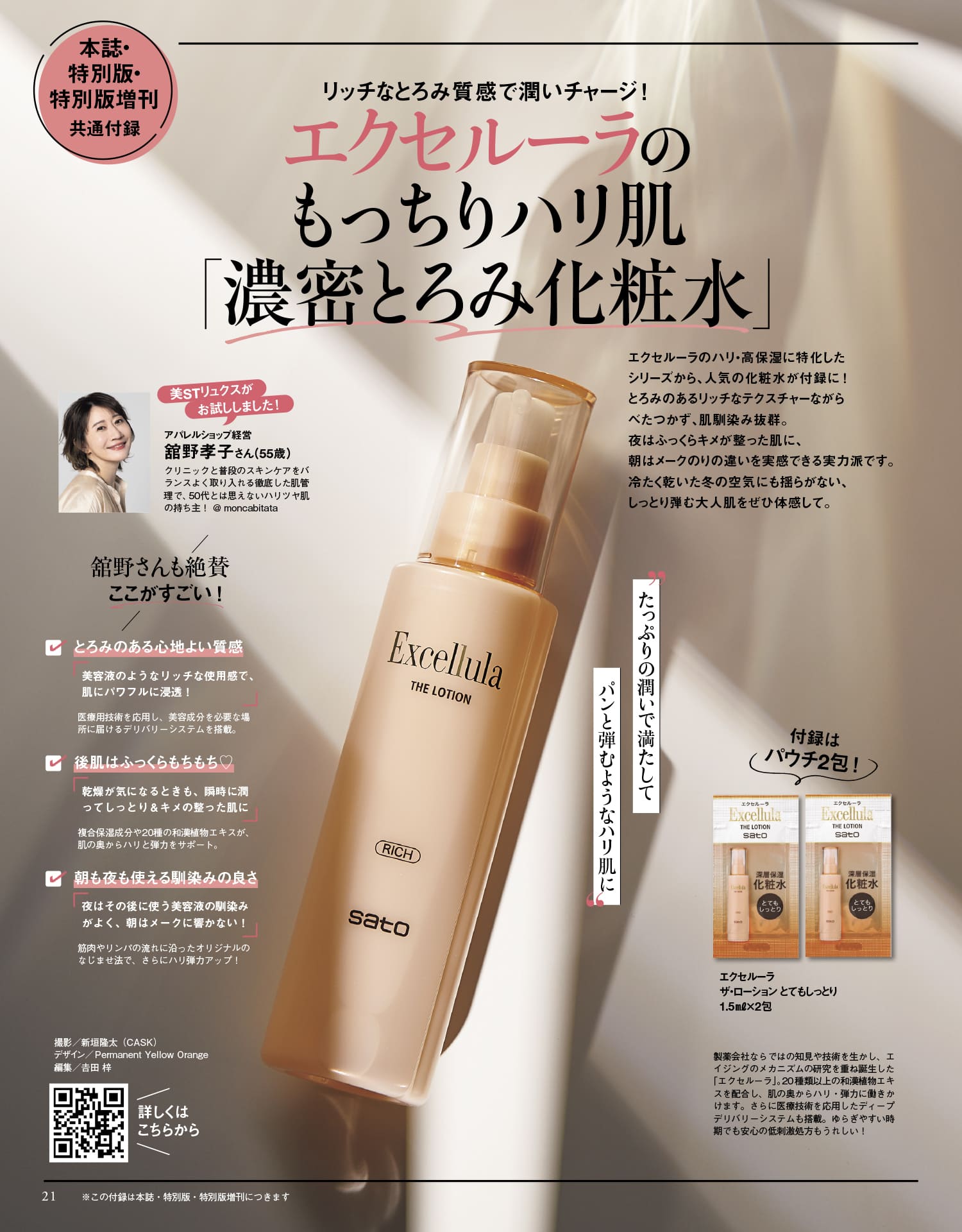 エクセルーラのハリ・高保湿に特化したシリーズから、人気の化粧水が付録に!とろみのあるリッチなテクスチャーながらべたつかず、肌馴染み抜群。夜はふっくらキメが整った肌に、朝はメークのりの違いを実感できる実力派です。冷たく乾いた冬の空気にも揺らがない、しっとり弾む大人肌をぜひ体感して。エクセルーラ ザ・ローションとてもしっとり 1.5ml×パウチ2包