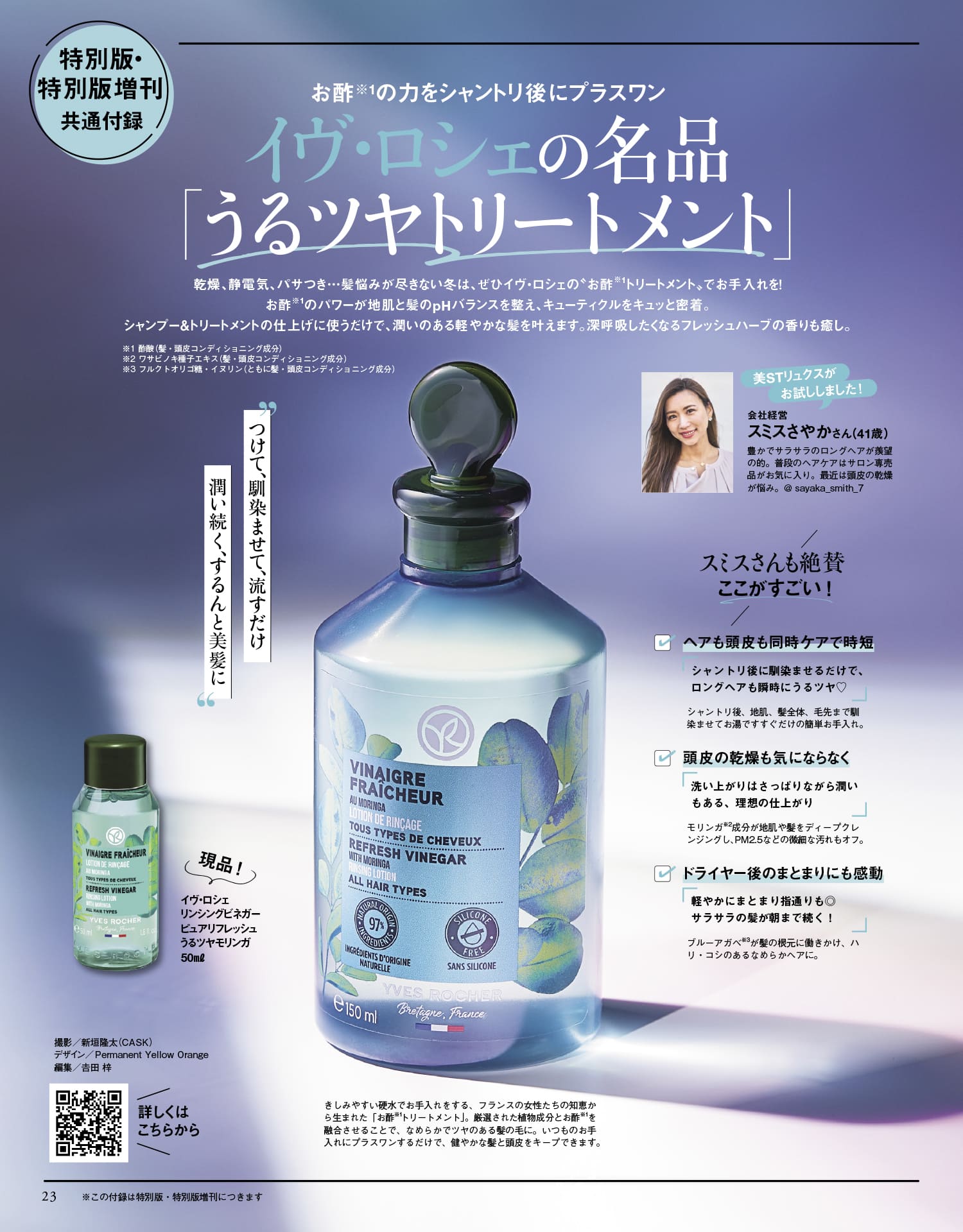 厳選された植物成分とお酢を融合させることで、なめらかでツヤのある髪の毛に。いつものお手入れにプラスワンするだけで、健やかな髪と頭皮をキープできます。50ml現品が付録に!イヴ・ロシェ リンシングビネガー ピュアリフレッシュ うるツヤモリンガ 50ml