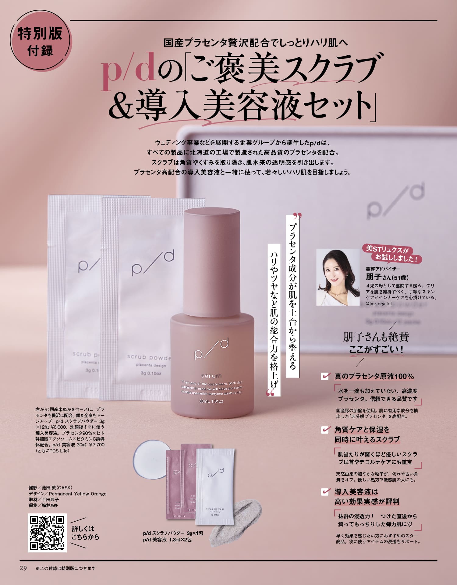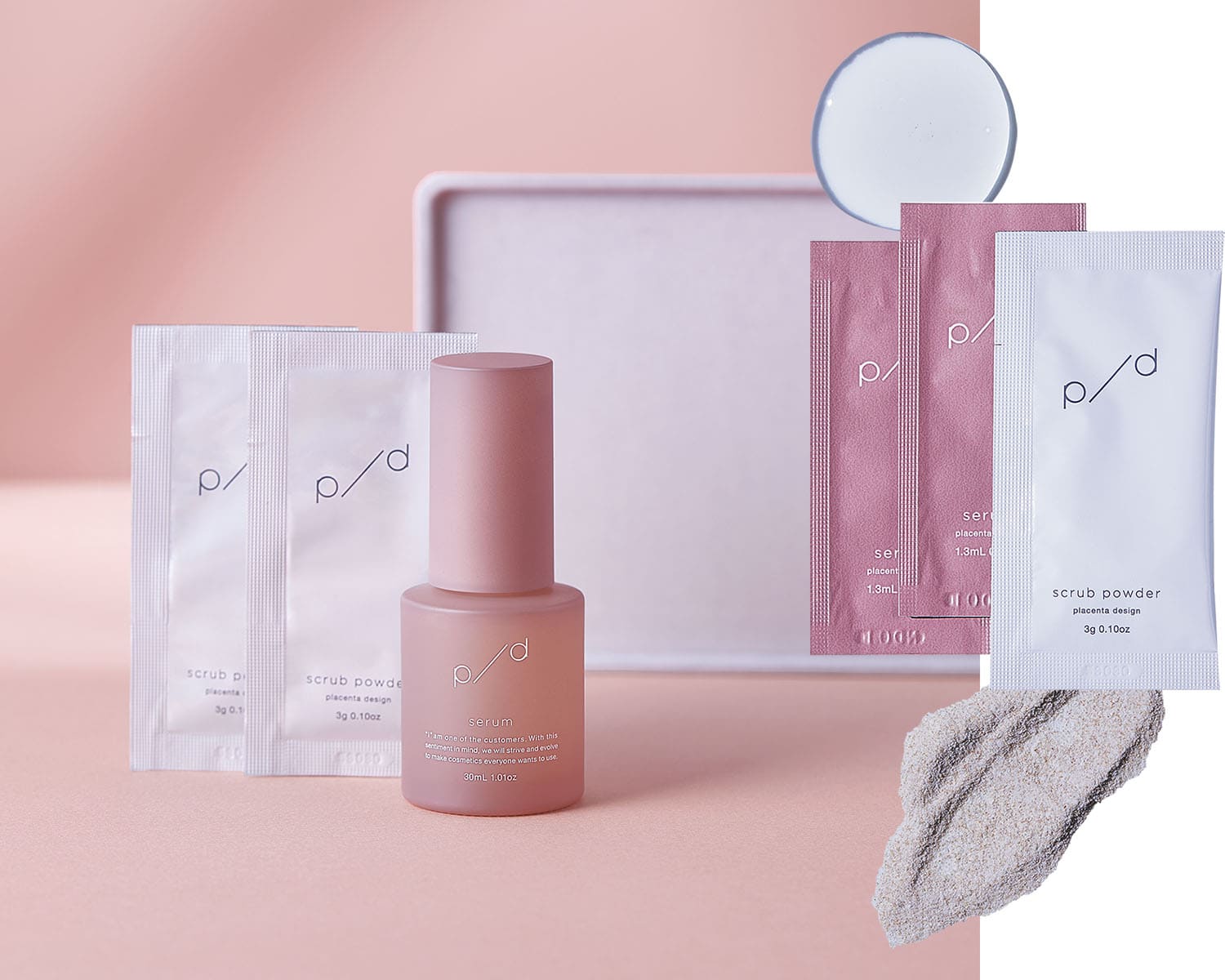 ウェディング事業などを展開する企業グループから誕生したp/dは、すべての製品に北海道の工場で製造された高品質のプラセンタを配合。スクラブは角質やくすみを取り除き、肌本来の透明感を引き出します。プラセンタ高配合の導入美容液と一緒に使って、若々しいハリ肌を目指しましょう。p/d スクラブパウダー 3g×1包、p/d 美容液 1.3ml×2包