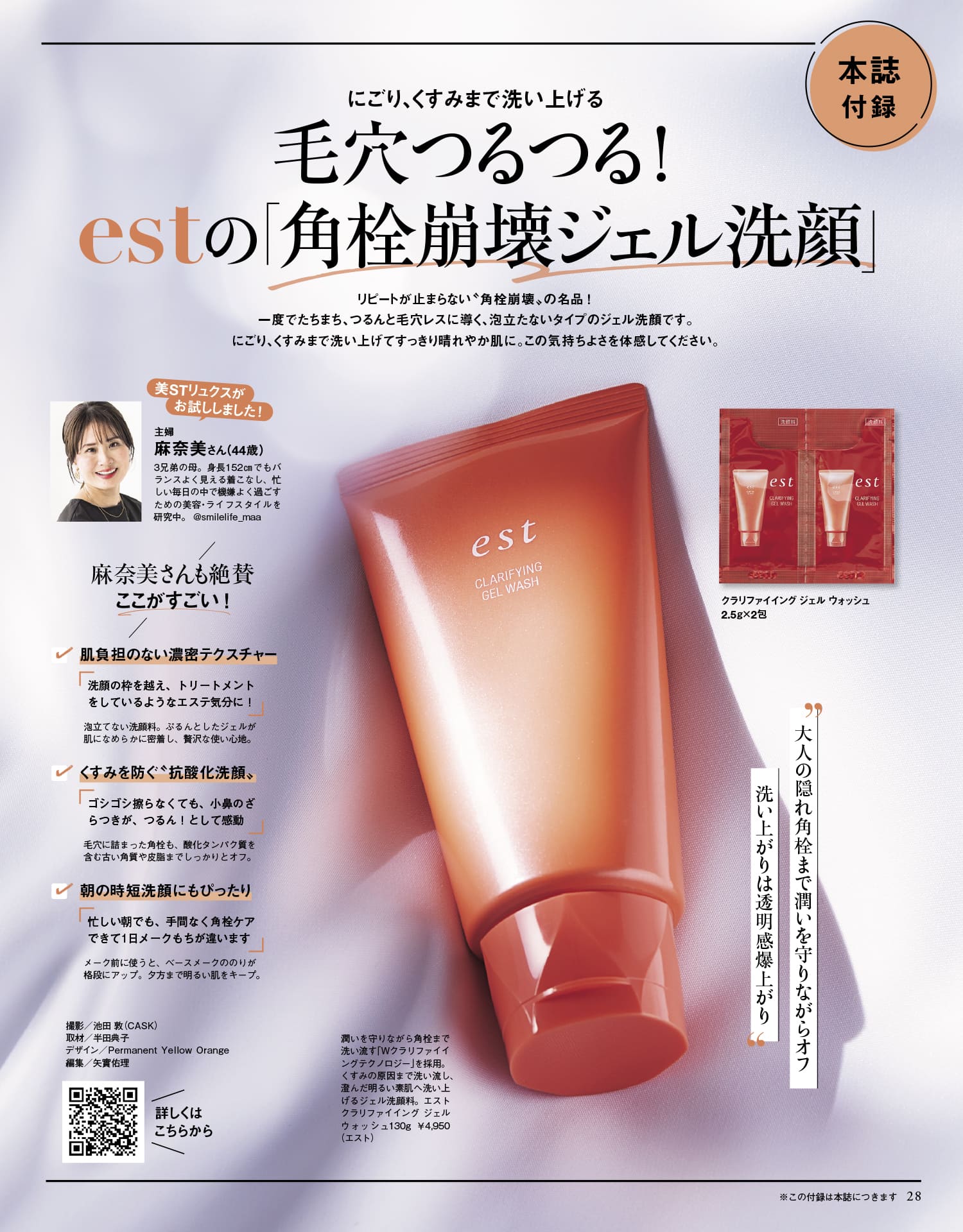 リピートが止まらない〝角栓崩壊〟の名品!一度でたちまち、つるんと毛穴レスに導く、泡立たないタイプのジェル洗顔です。にごり、くすみまで洗い上げてすっきり晴れやか肌に。この気持ちよさを体感してください。クラリファイイング ジェル ウォッシュ 2.5g×2包