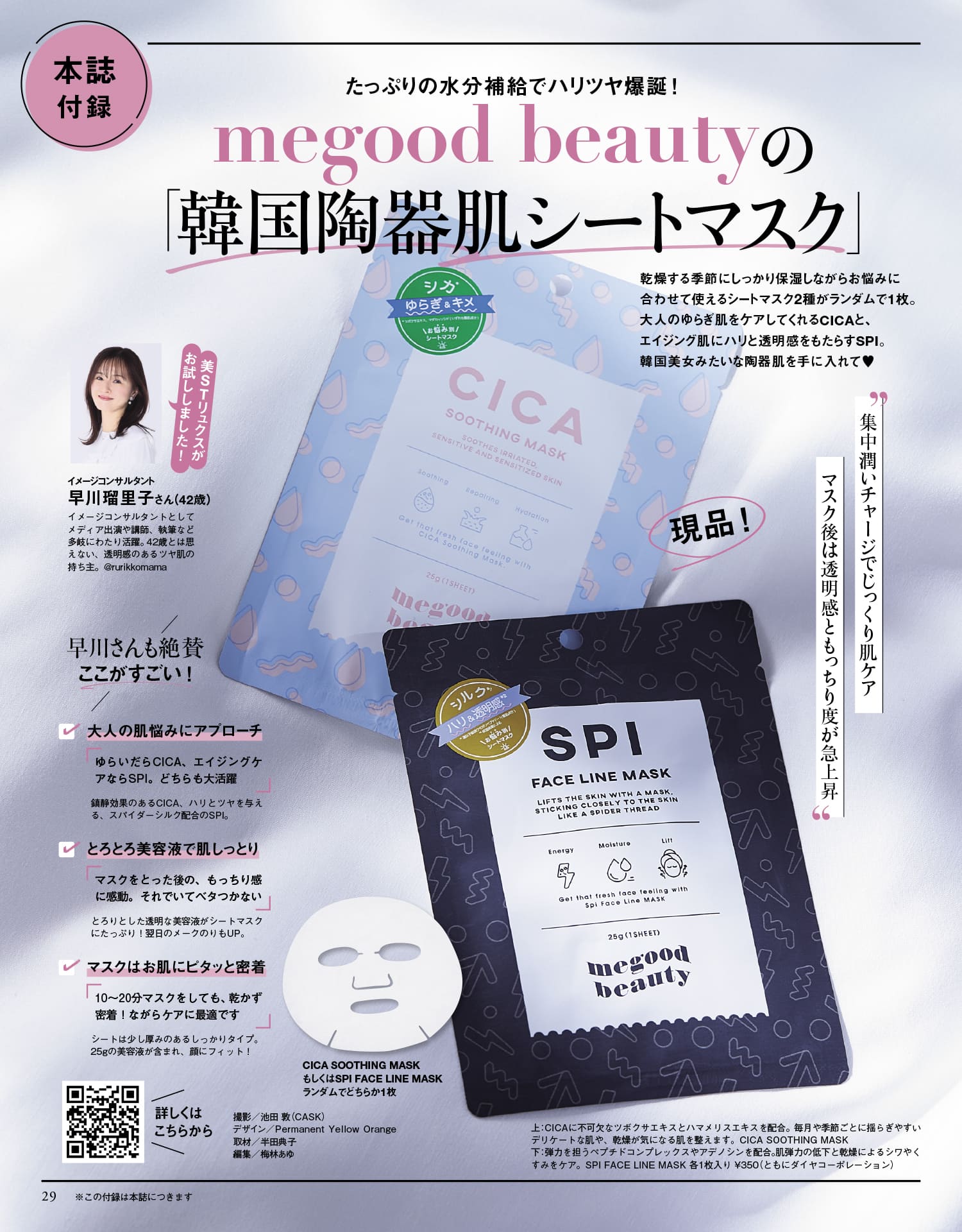 乾燥する季節にしっかり保湿しながらお悩みに合わせて使えるシートマスク2種が、ランダムで1枚が現品付録に。大人のゆらぎ肌をケアしてくれるCICAと、エイジング肌にハリと透明感をもたらすSPI。韓国美女みたいな陶器肌を手に入れて♥CICA SOOTHING MASKもしくはSPI FACE LINE MASK、ランダムでどちらか1枚