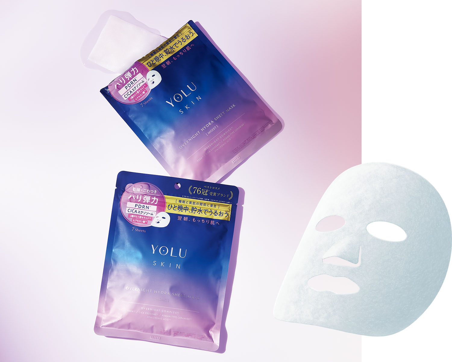 しっとりうるおうモイストタイプのシートマスクは1日の終わりに肌へしっかり水分と美容成分をチャージしてくれます。CICAエクソソームやツボクサエキスなど整肌成分が肌トラブルにアプローチ。ヒアルロン酸やPDRN、ヒト型セラミド3種など、うるおう美容成分も豊富に配合。YOLUスキン オーバーナイト ハイドラシートマスク モイスト 1枚入り