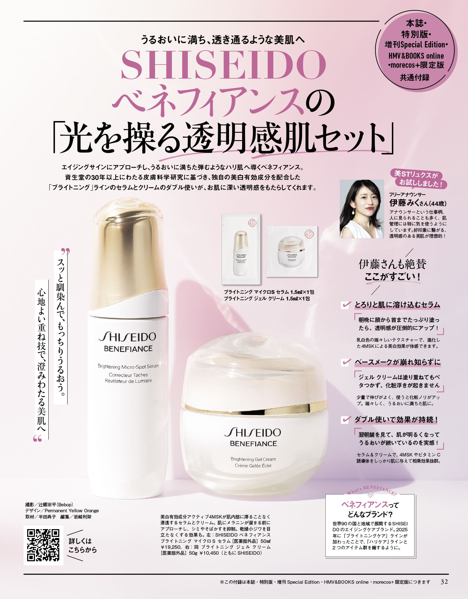 エイジングサインにアプローチし、うるおいに満ちた弾むようなハリ肌へ導くベネフィアンス。資生堂の30年以上にわたる皮膚科学研究に基づき、独自の美白有効成分を配合した「ブライトニング」ラインのセラムとクリームのダブル使いを付録でお試しください!ブライトニング マイクロS セラム 1.5ml×パウチ1包、ブライトニング ジェル クリーム 1.5ml×パウチ1包