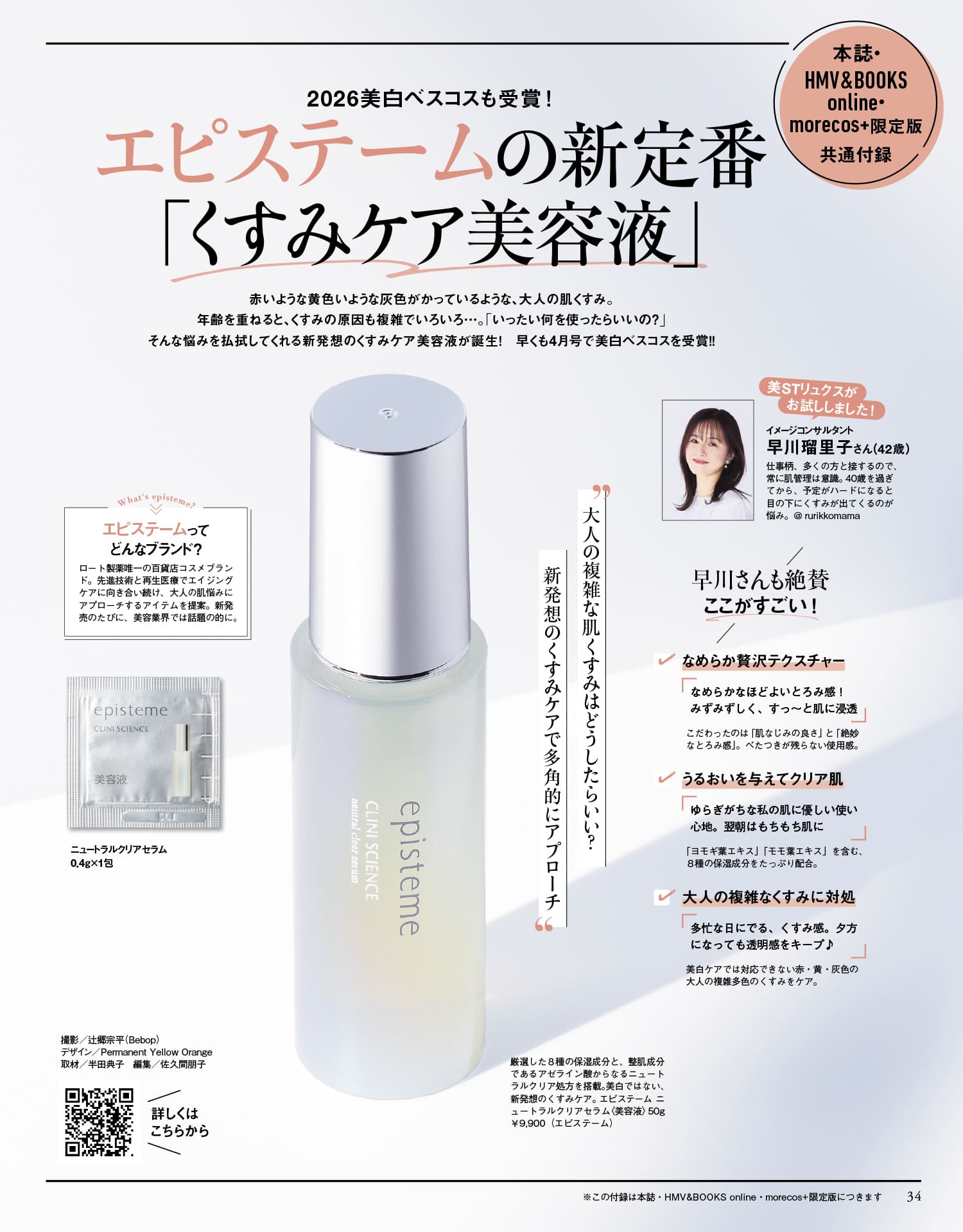4月号で美白ベスコスを受賞した美容液を早くもお試しできます!厳選した8種の保湿成分と、整肌成分であるアゼライン酸からなるニュートラルクリア処方を搭載。美白ではない、新発想のくすみケア。エピステーム ニ ュートラルクリアセラム<美容液>0.4g×パウチ1包