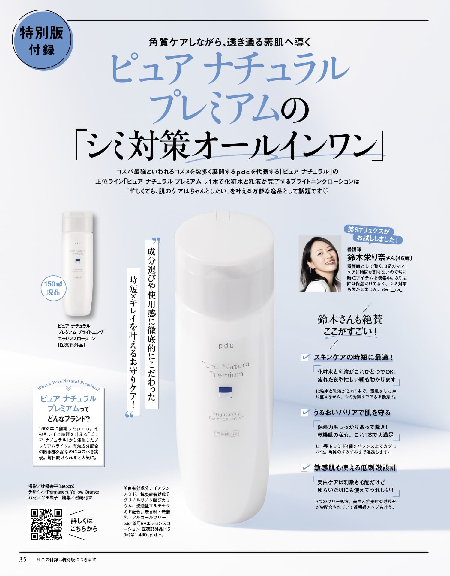 コスパ最強といわれるコスメを数多く展開するpdcを代表する「ピュア ナチュラル」の上位ライン「ピュア ナチュラル プレミアム」。「忙しくても、肌のケアはちゃんとしたい」を叶える万能な逸品として話題に!ピュア ナチュラル プレミアム ブライトニング エッセンスローション[医薬部外品]150ml 現品