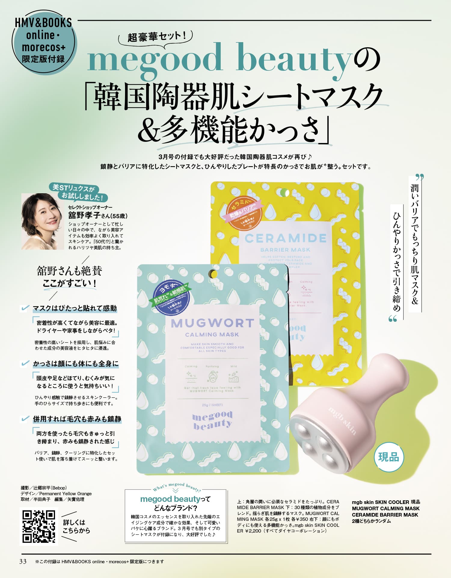 美ST3月号の付録でも大好評だった韓国陶器肌コスメが再び♪鎮静とバリアに特化したシートマスクと、ひんやりしたプレートが特長のかっさでお肌が〝整う〟超豪華セットです。mgb skin SKIN COOLER 現品・MUGWORT CALMING MASK CERAMIDE BARRIER MASK 2種どちらかランダムで1枚