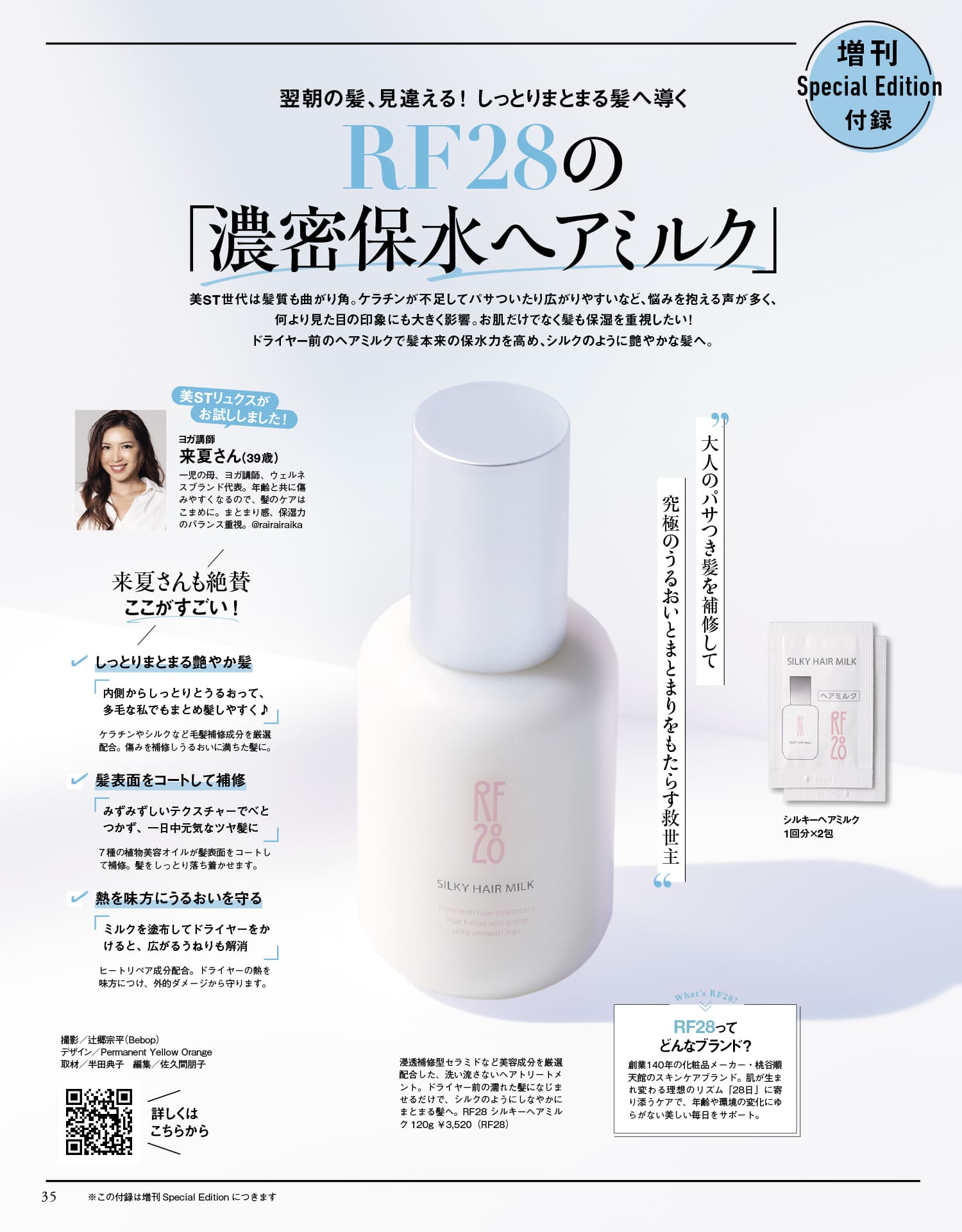 浸透補修型セラミドなど美容成分を厳選配合した、洗い流さないヘアトリートメント。ドライヤー前の濡れた髪になじませるだけで、シルクのようにしなやかにまとまる髪へ。RF28 シルキーヘアミルク 1回分×パウチ2包