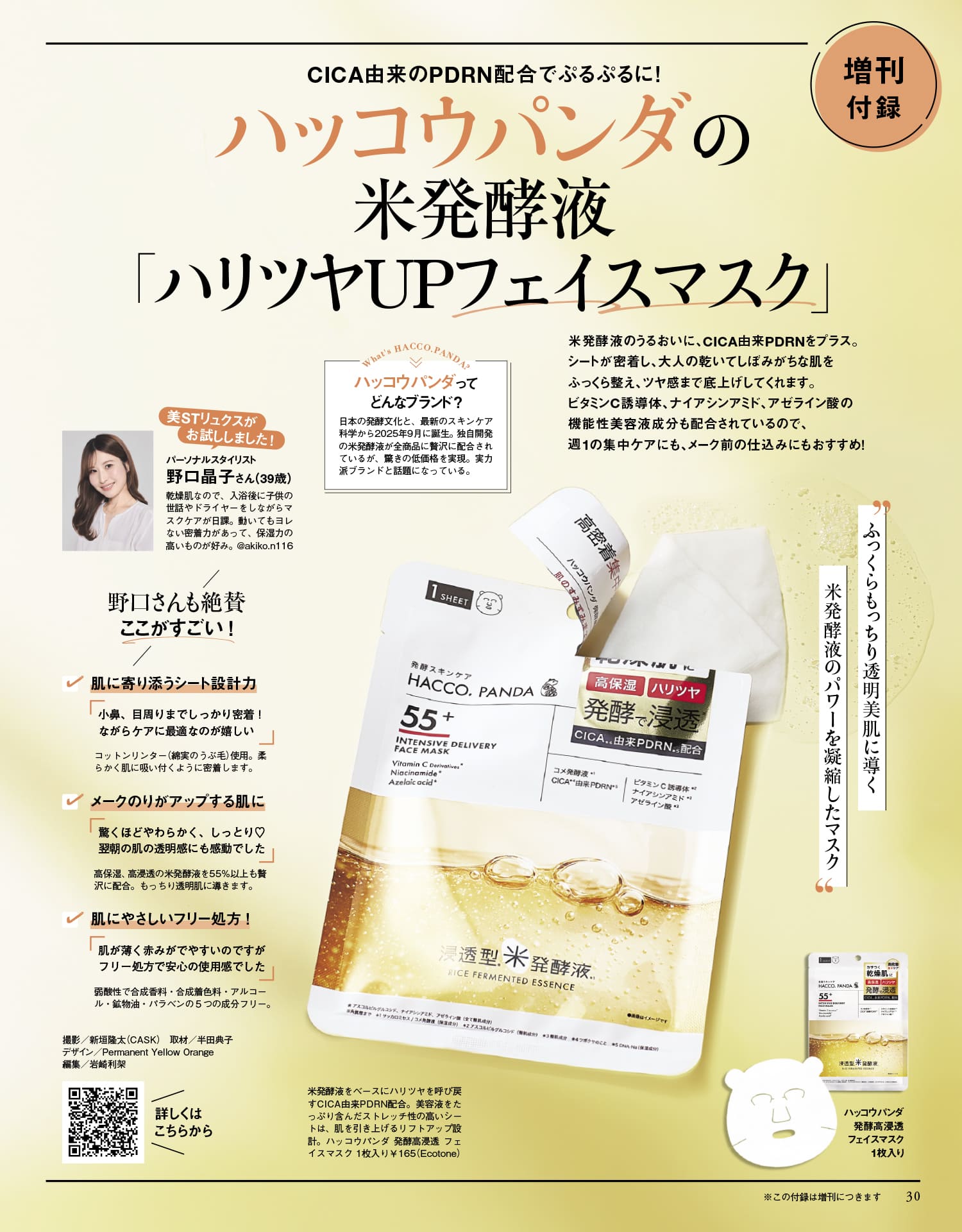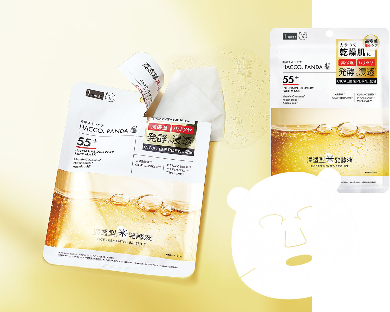 米発酵液のうるおいに、CICA由来PDRNをプラス。シートが密着し、大人の乾いてしぼみがちな肌をふっくら整え、ツヤ感まで底上げしてくれるシートマスク。ビタミンC誘導体、ナイアシンアミド、アゼライン酸の機能性美容液成分も配合されているので、週1の集中ケアにも、メーク前の仕込みにもおすすめです!ハッコウパンダ 発酵高浸透フェイスマスク1枚入り