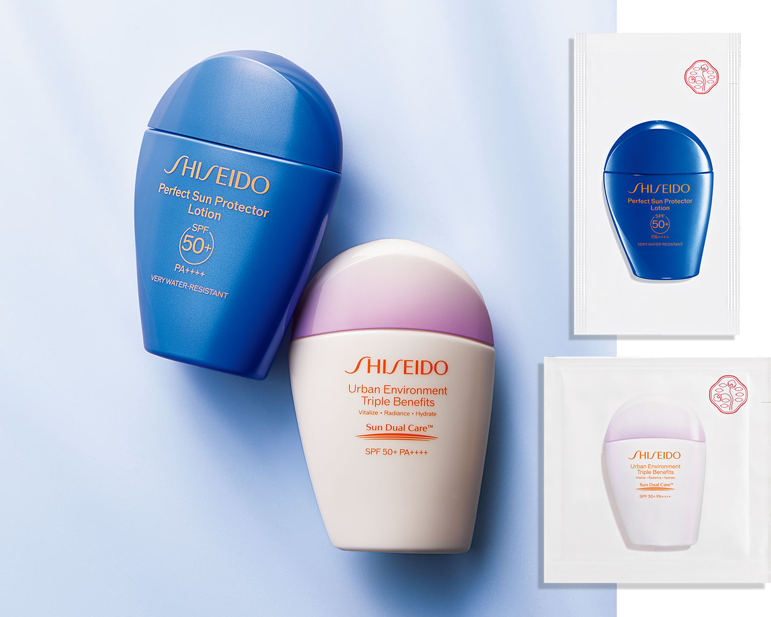 UV対策のレベルを格上げする最強のふたつの日焼け止め。紫外線量がぐっと増える今こそ、美肌のために〝守る習慣〟をはじめてみて。SHISEIDO パーフェクト サン プロテクター ローション SPF50+・PA++++ パウチ1包(2ml)、SHISEIDO アーバン トリプル ビューティ サンケア エマルジョン SPF50+・PA++++ パウチ1包(2ml)