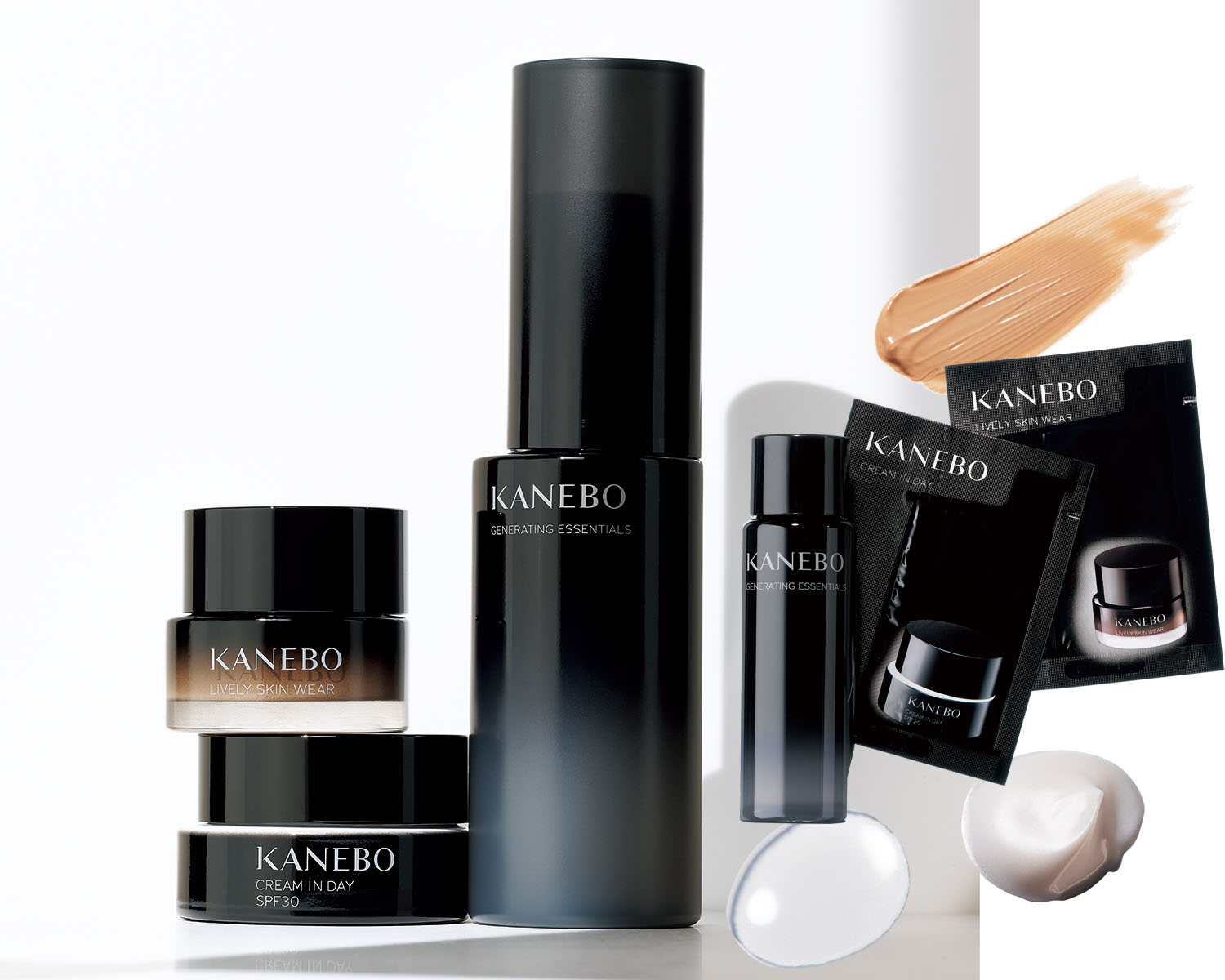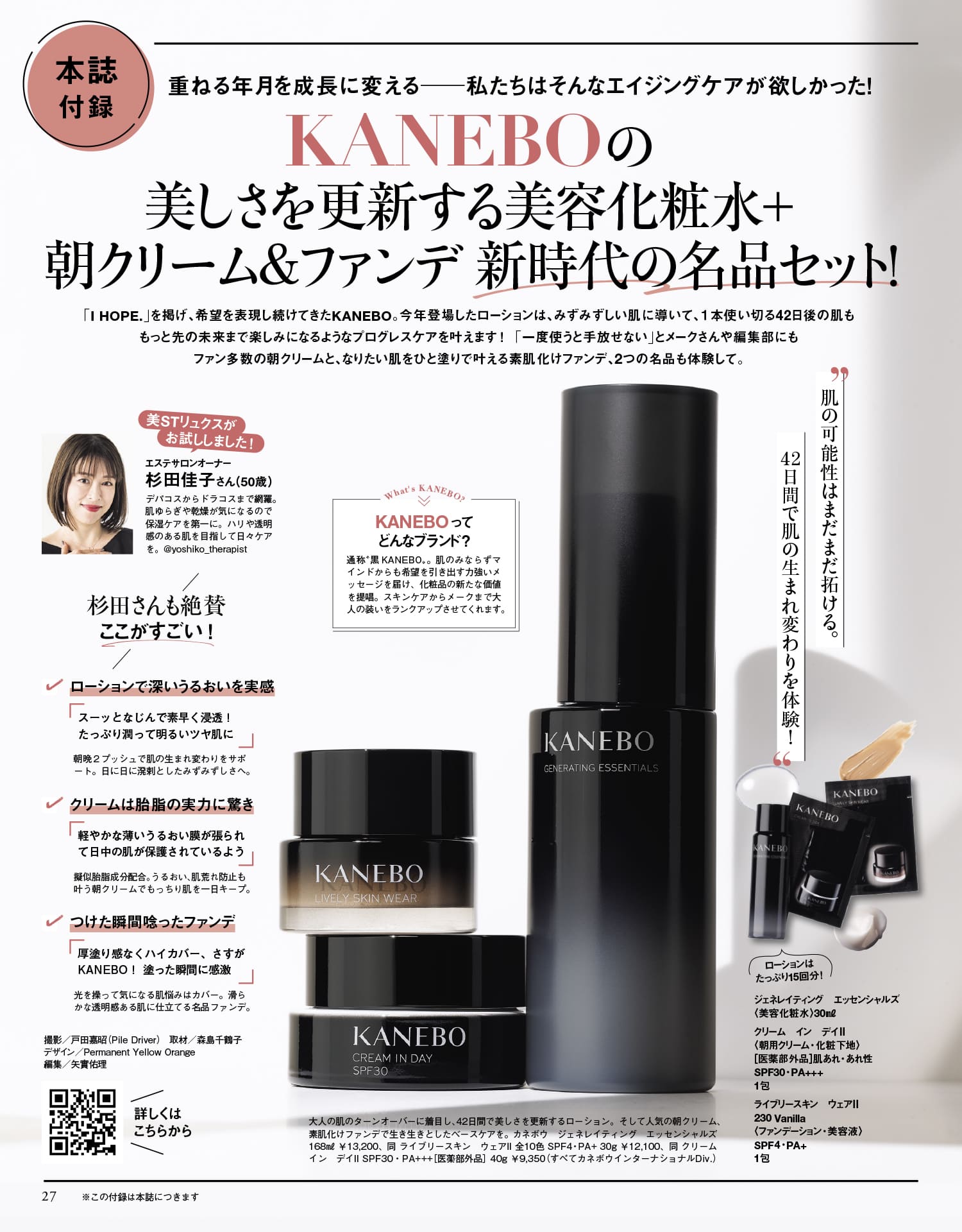 今年登場したローションは、みずみずしい肌に導いて、1本使い切る42日後の肌ももっと先の未来まで楽しみになるようなプログレスケアを叶えます!「一度使うと手放せない」とメークさんや編集部にもファン多数の朝クリームと、なりたい肌をひと塗りで叶える素肌化けファンデ、2つの名品も体験して。ジェネレイティング エッセンシャルズ〈美容化粧水〉ミニボトル30ml、クリーム イン デイII〈朝用クリーム・化粧下地〉[医薬部外品]肌あれ・あれ性 SPF30・PA+++ パウチ1包、ライブリースキン ウェアII 230 Vanilla〈ファンデーション・美容液〉SPF4・PA+ パウチ1包