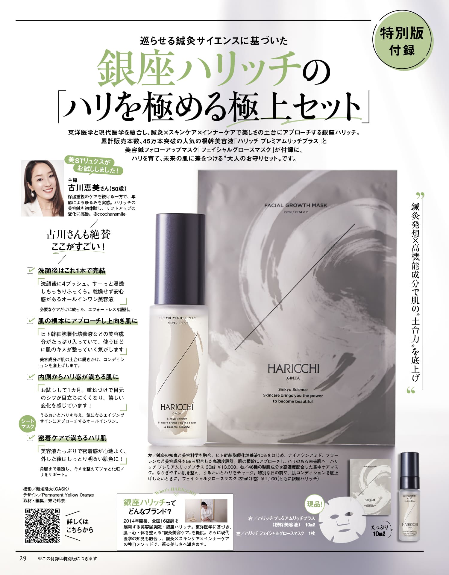東洋医学と現代医学を融合し、鍼灸×スキンケア×インナーケアで美しさの土台にアプローチする銀座ハリッチ。累計販売本数、45万本突破の人気の根幹美容液と美容鍼フォローアップマスクが特別版付録に。ハリッチ プレミアムリッチプラス(根幹美容液)10ml ミニボトル、ハリッチ フェイシャルグロースマスク 1枚