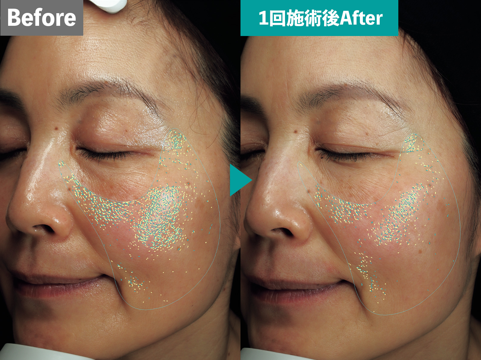 VISIAで肌表面の細かい凹凸を解析し、質感、キメを測定します。キメの項目で数値が低い場合は、角質が厚くなり、表面がかさつき、炎症を起こしている証拠。また乾燥により角質に乱れが生じる場合も。キメが整っている場合は凹凸が均一で滑らかな状態です。キメは水分量や保湿状態の判断基準に。施術後は質感が約20%アップ! おのずと肌に艶感がアップするのも頷けます。初心者にもトライしやすい基本的な治療ながら、定期的に継続したくなる効果が嬉しい。