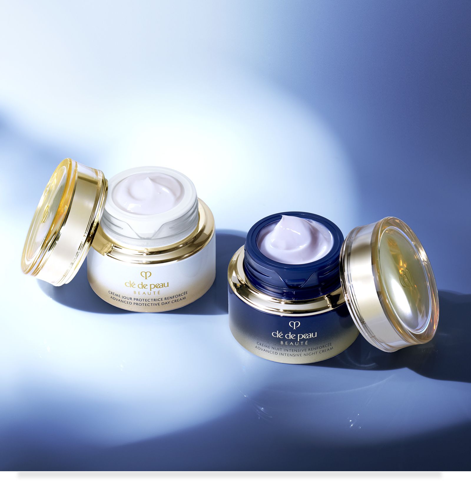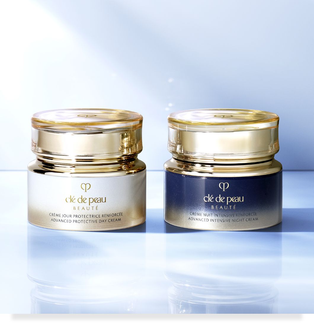 左:濃密なうるおいで日中の肌を紫外線や乾燥などの環境ダメージからガードし、ハリと弾力のある肌へと導く日中用クリーム。クレームプロテクトゥリスR(ジュール)〈乳液・クリーム〉(日中用)SPF25・PA+++ 50g ¥16,500、レフィル 50g ¥14,850、右:日中に受けた肌ダメージを優しくケア、夜間に健やかなハリ肌を作る夜用クリーム。クレームアンタンシヴR(ニュイ)〈乳液・クリーム〉(夜用)50g ¥19,250、レフィル 50g ¥17,600(ともにクレ・ド・ポー ボーテ)