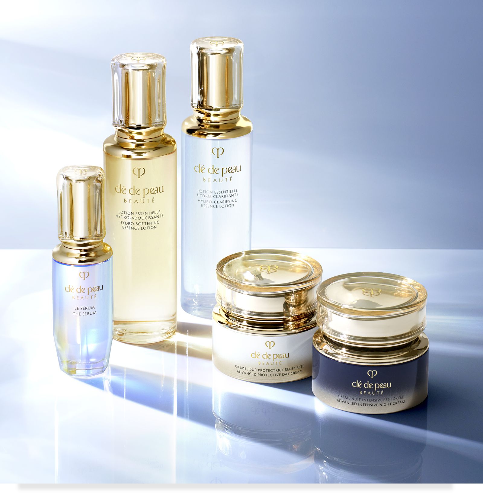 左から:肌本来の美しさの源にアプローチして輝きを生み出すファーストステップ美容液。うるおいバリアを整えて、将来の肌荒れにつながる乾燥などの様々なダメージから肌を守ります。ル・セラムII〈美容液〉50ml ¥30,800、2種のローションには独自成分プレシャス米麹発酵エキス※3を新配合。独自浸透技術によりみずみずしいうるおいで角層を満たします。肌荒れや乾燥を防いで健やかなツヤのある肌に。ローションエサンシエルA〈化粧水〉(モイスト)170ml ¥14,300、明るく透明感のある肌に。ローションエサンシエルC〈化粧水〉(クリア)170ml ¥14,300、昼の肌リズムに着目、日中の肌を紫外線や乾燥から守ってうるおいあるハリ肌に。クレームプロテクトゥリスR(ジュール)〈乳液・クリーム〉(日中用)SPF25・PA+++ 50g ¥16,500、日中に受けた肌ダメージを優しくケア、健やかなハリ肌を作る夜用クリーム。クレームアンタンシヴR(ニュイ)〈乳液・クリーム〉(夜用)50g ¥19,250(すべてクレ・ド・ポー ボーテ)