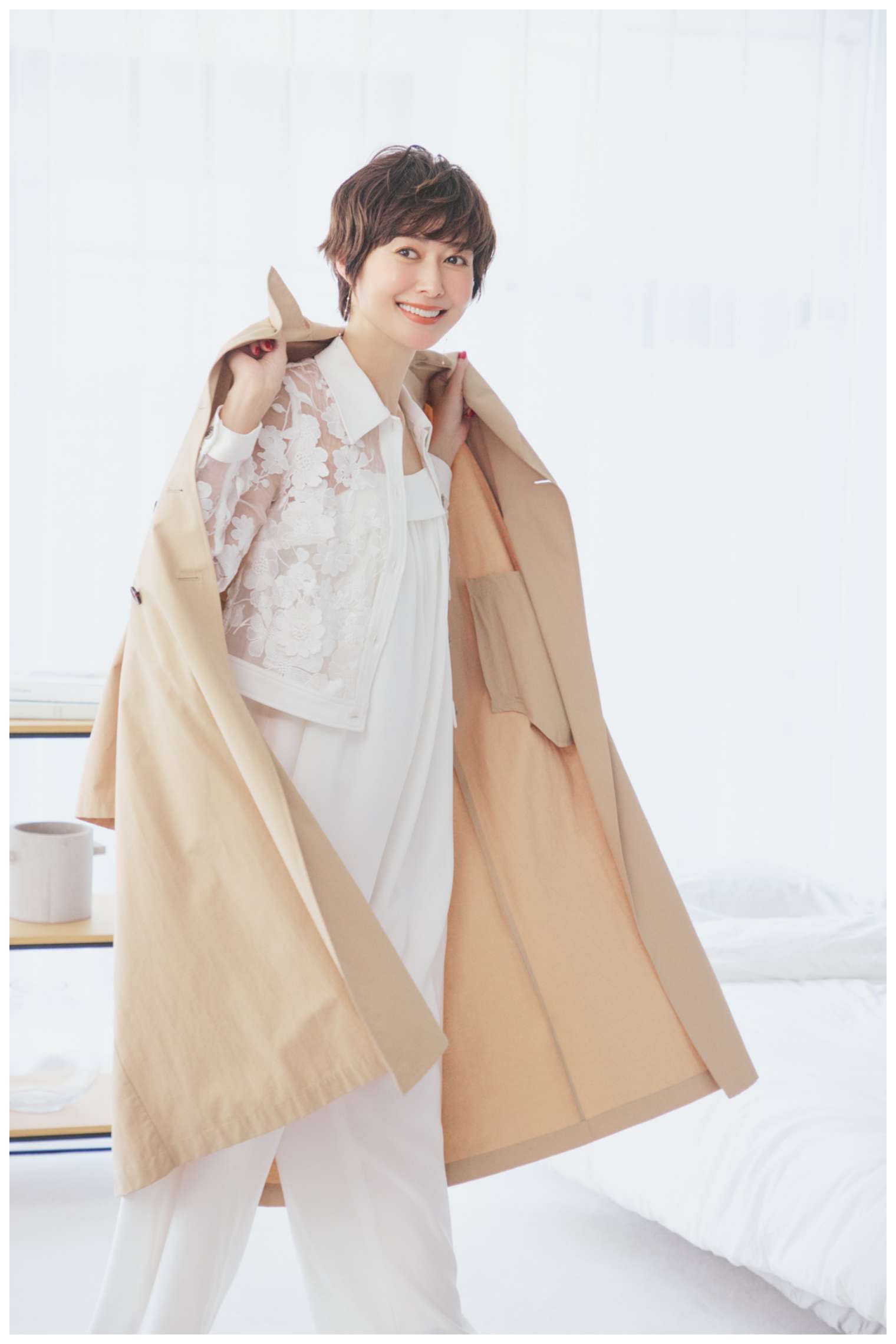 トレンチコート¥37,400(ジャスグリッティー プレスルーム) レースシャツ¥61,600 ,オールインワン¥53,900(ともにソブ/フィルム) ピアス¥91,300,リング¥440,000(ともにマリハ) ポーチ¥34,100(ボナベンチュラ)