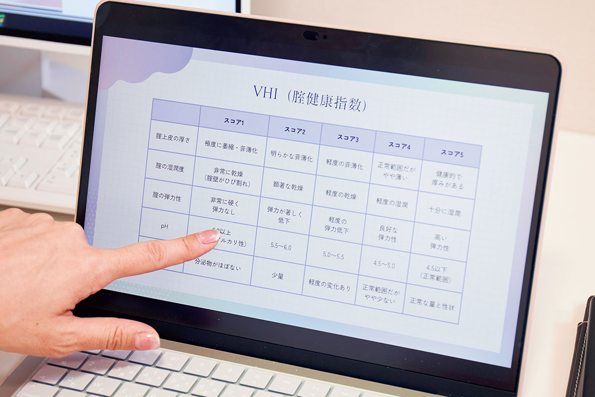 GSMの指標である腟健康指数は、S.Iさんの場合25点中12点とやや低め。ケーゲル体操で骨盤底筋を鍛え、腟内のペーハーが6.1以上と乾燥しているので腟育注射で潤いを補うのが良さそうです。出産のダメージで開いた腟の見た目や乾燥が気になるなら腟口形成を。大陰唇は黒ずみもたるみもなく綺麗でしたので安心してください。