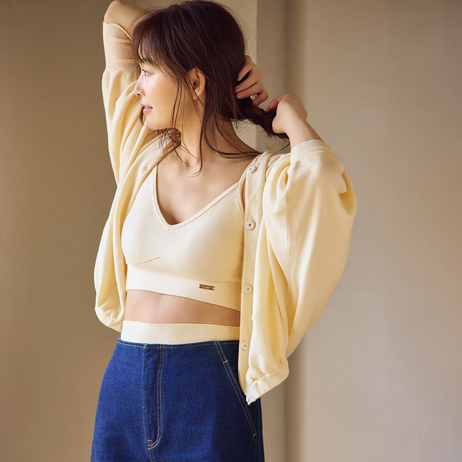ファッションと機能性を兼ね備えたニットランジェリー。見えてもお洒落なブラにフーディーをさっと羽織り、トレンドのハイウエストデニムからあえてウエストを覗かせて、お家スタイルもセンスアップ。ニットソフトブラレット ¥6,490、ハラマキショーツ ¥6,490、シルクプロテイン加工ドルマンフーディー ¥13,750(すべて+FT SUPREME.LA.LA.)デニム ¥53,900(ジェイドット/ジェイドット 自由が丘八雲店)