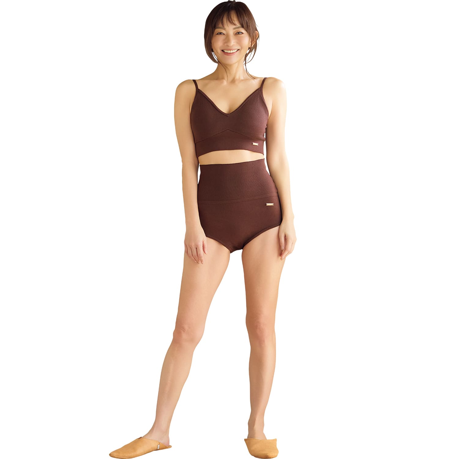 体のラインが引き締まって見えるブラウンをオーダー。ソフトブラレット ¥6,490、ハラマキショーツ ¥6,490(ともに+FT SUPREME.LA.LA.)ルームシューズ/スタイリスト私物