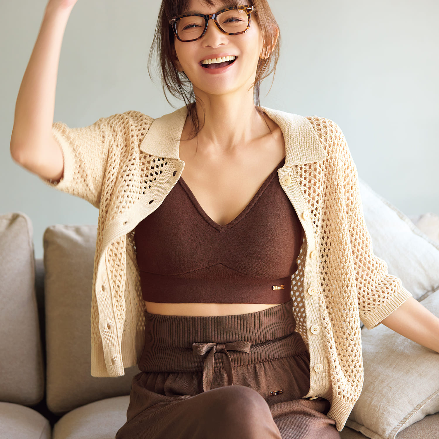 これからのシーズンにぴったりな、温かみのあるブラウンは、どんな肌色にもしっくり馴染みます。ソフトガードルが内蔵されたシルクプロテイン加工のジョガーパンツに合わせることで、リラックス感もありながらメリハリボディに。ニットソフトブラレット ¥6,490、ハラマキショーツ ¥6,490、シルクプロテイン加工ジョガーパンツ ¥16,940(すべて+FT SUPREME.LA.LA.)カーディガン ¥10,989(ドゥクラッセ)