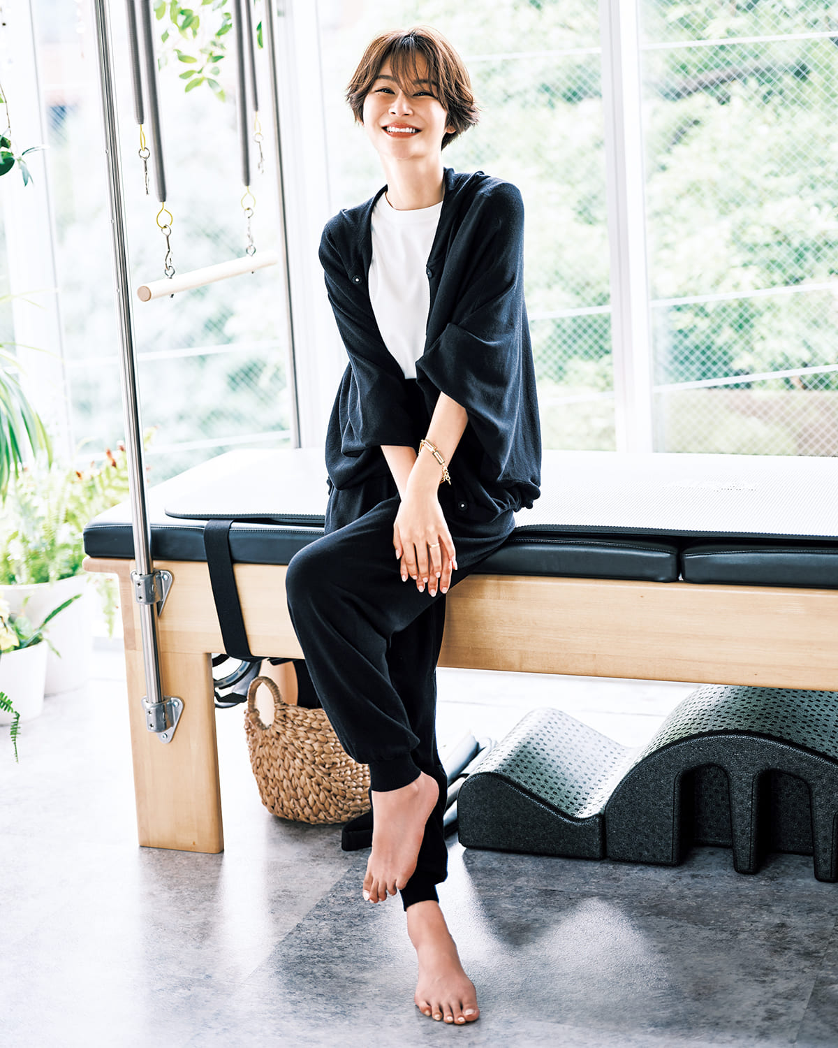 サラサラ素材のパーカに、冷えやすいお腹をカバーするハイウエストリブのジョガーパンツ。カジュアルなニットアップもモノトーンでまとめてリッチ見せ。パーカ ¥13,750 パンツ ¥16,940(ともに+FT SUPREME.LA.LA.)Tシャツ ¥9,350(ジェイドット/ジェイドット 自由が丘八雲店)ブレスレット ¥23,100(ワンエーアールバイウノアエレ/ウノアエレ ジャパン)