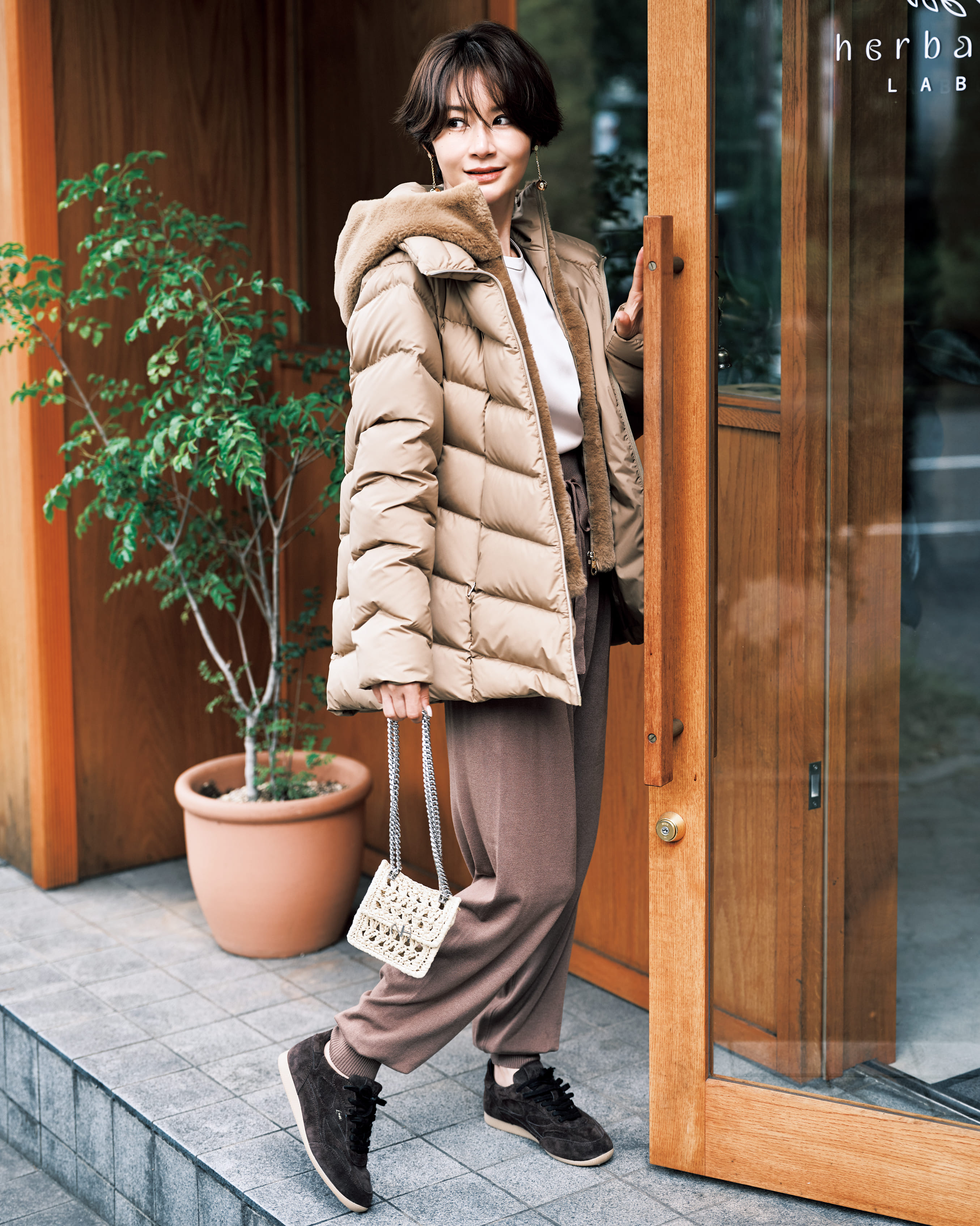 気になる最旬ボトムスのジョガーパンツは茶系ワントーンにまとめてクラス感アップ