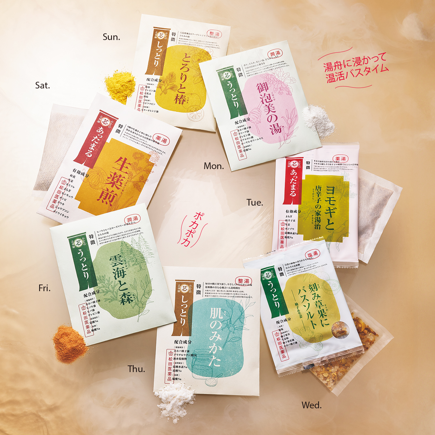 7種×2包 内容:御泡美の湯、ヨモギと唐辛子の家湯治、刻み草果にバスソルト/柚子&生姜、肌のみかた、雲海と森、生薬煎、とろりと椿