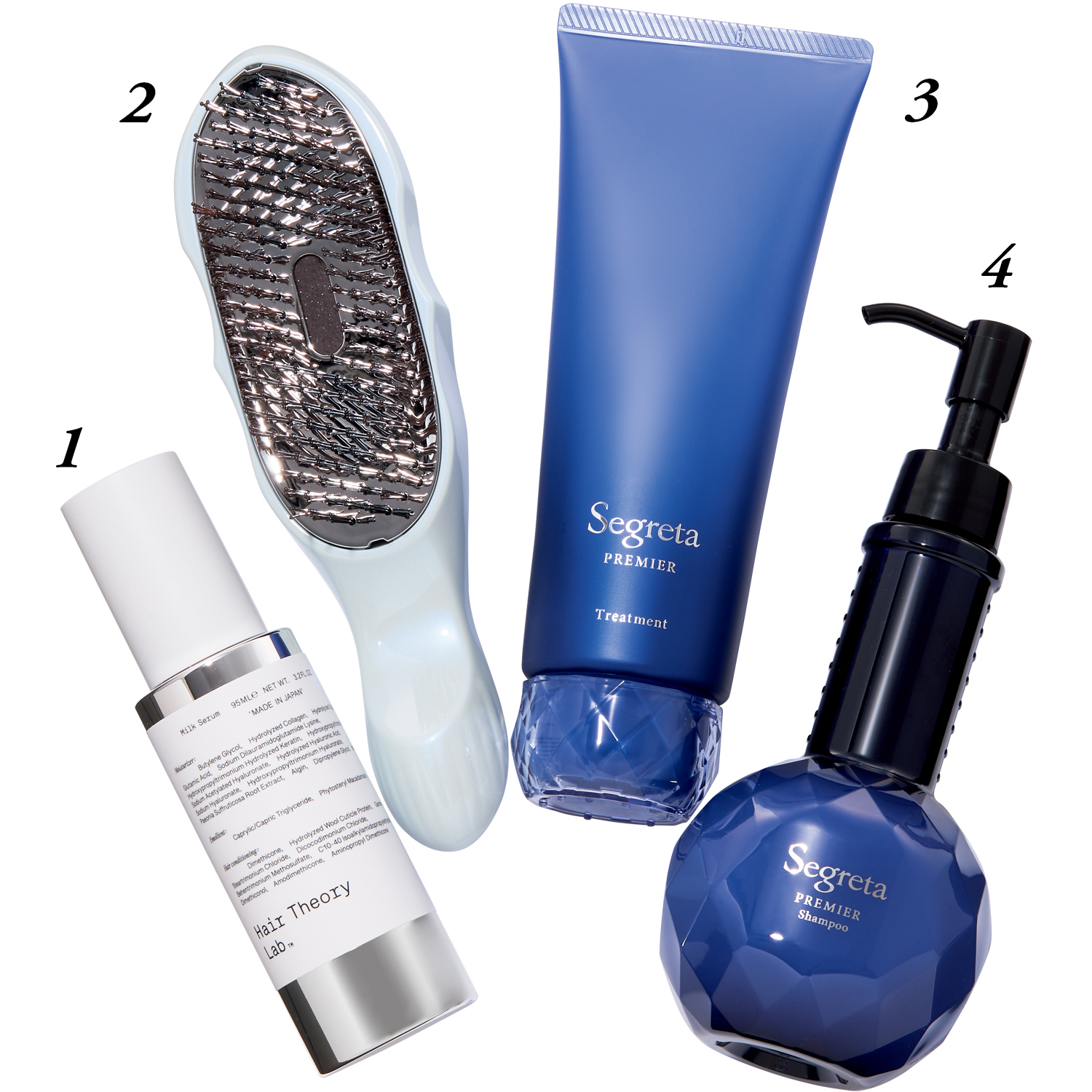 1.【ヘアセオリーラボ】ヘアミルクセラム ミルクタイプでべたつかず素早く浸透。ドライヤーの前に使用するとまとまりのあるさらさらヘアに。95ml ¥4,400(ヘアセオリーラボ)2.【リファ】リファ イオンケアブラシプレミアム シャンプーの途中に髪を根元からブラッシング。頭皮の毛穴がすっきりし、髪にまとまりが出ます。¥8,500(MTG)3.【花王 セグレタ プレミア】質感変化トリートメント 濃厚なテクスチャーで髪になじませた瞬間から指通りなめらか。200g ¥2,420〈編集部調べ〉4.【花王 セグレタ プレミア】凝縮美容液シャンプー 美容成分で洗っているの!? と思ってしまうほど、香りも泡立ちもリッチ。200ml ¥2,420〈編集部調べ〉 (ともに花王 相談窓口)