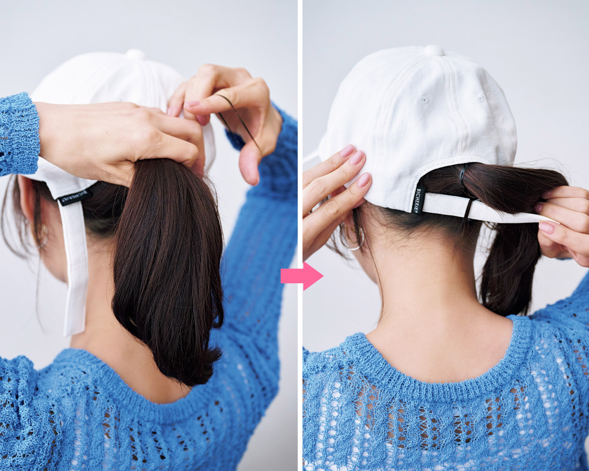 後ろの留め具を外してから帽子を被り、穴の位置で一本結びをします。留め具をはめて完成。顔周りの毛は帽子に入れ込まず自然に出しておくとカジュアルすぎずおしゃれ感あり。