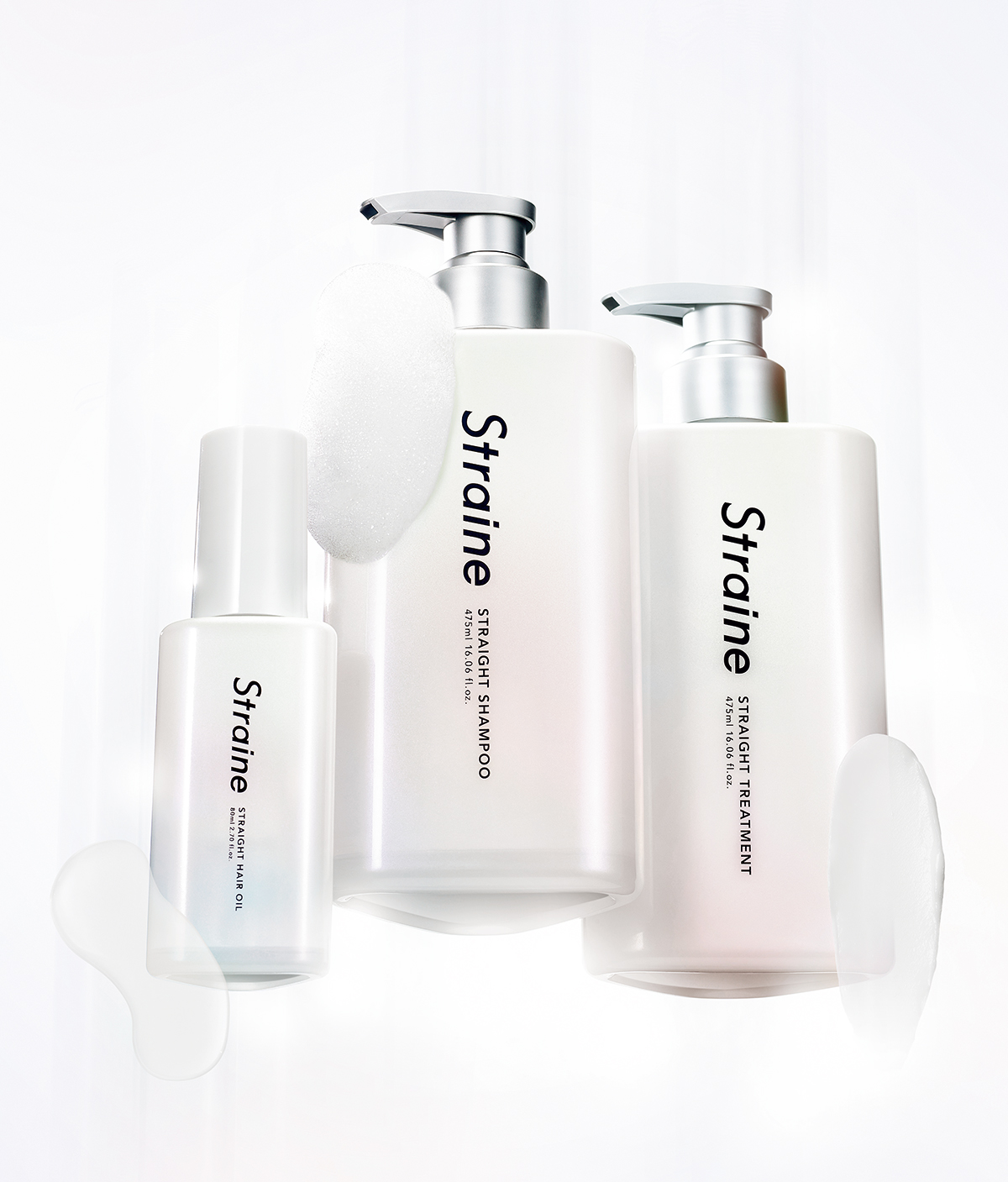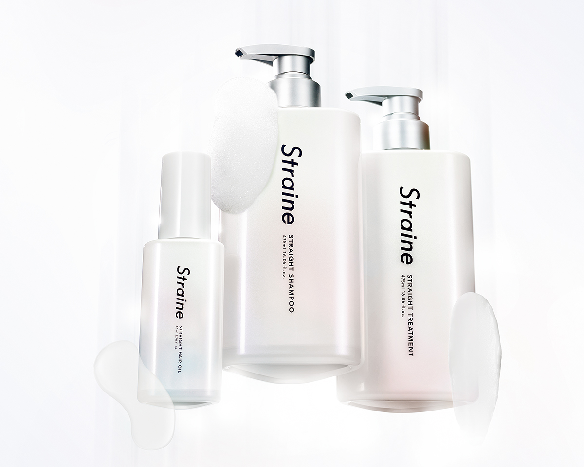 中:ストレイン ストレートシャンプー 475㎖ 右:ストレイン ストレートトリートメント 475㎖ 左:ストレイン ストレートヘアオイル 80㎖ 各¥1,980/すべてStraine