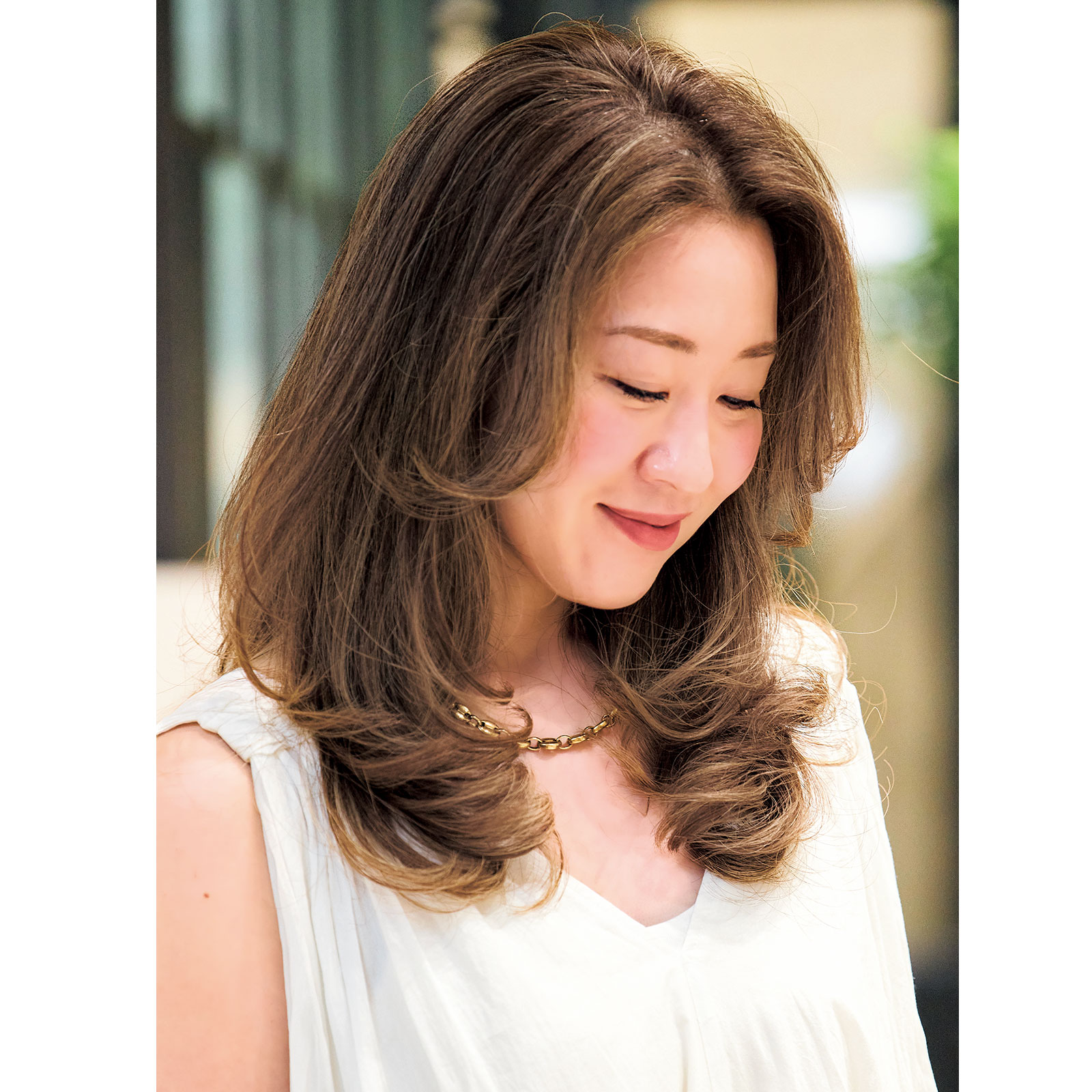 仕事柄、黒髪&まとめ髪がしやすいワンレングスでしたが、重く見えるのが悩みでした。ハーフアップもできる、口元の高さからレイヤーを入れたら、断然軽やかでトップも顔周りもふんわりと優しげな表情に。