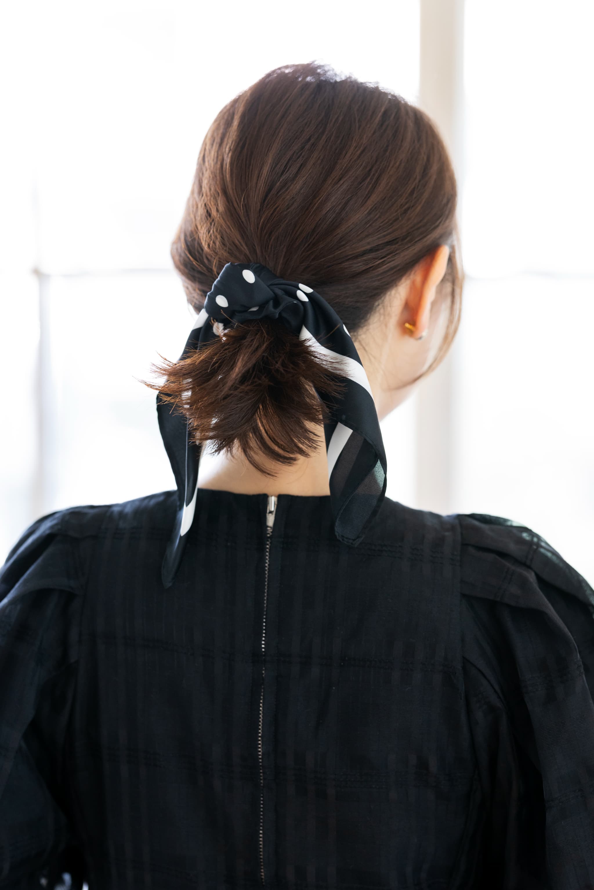 シュシュタイプのリボンスカーフをセット。ピンとした毛束が隠れるようにリボンのバランスを整えれば完成です。