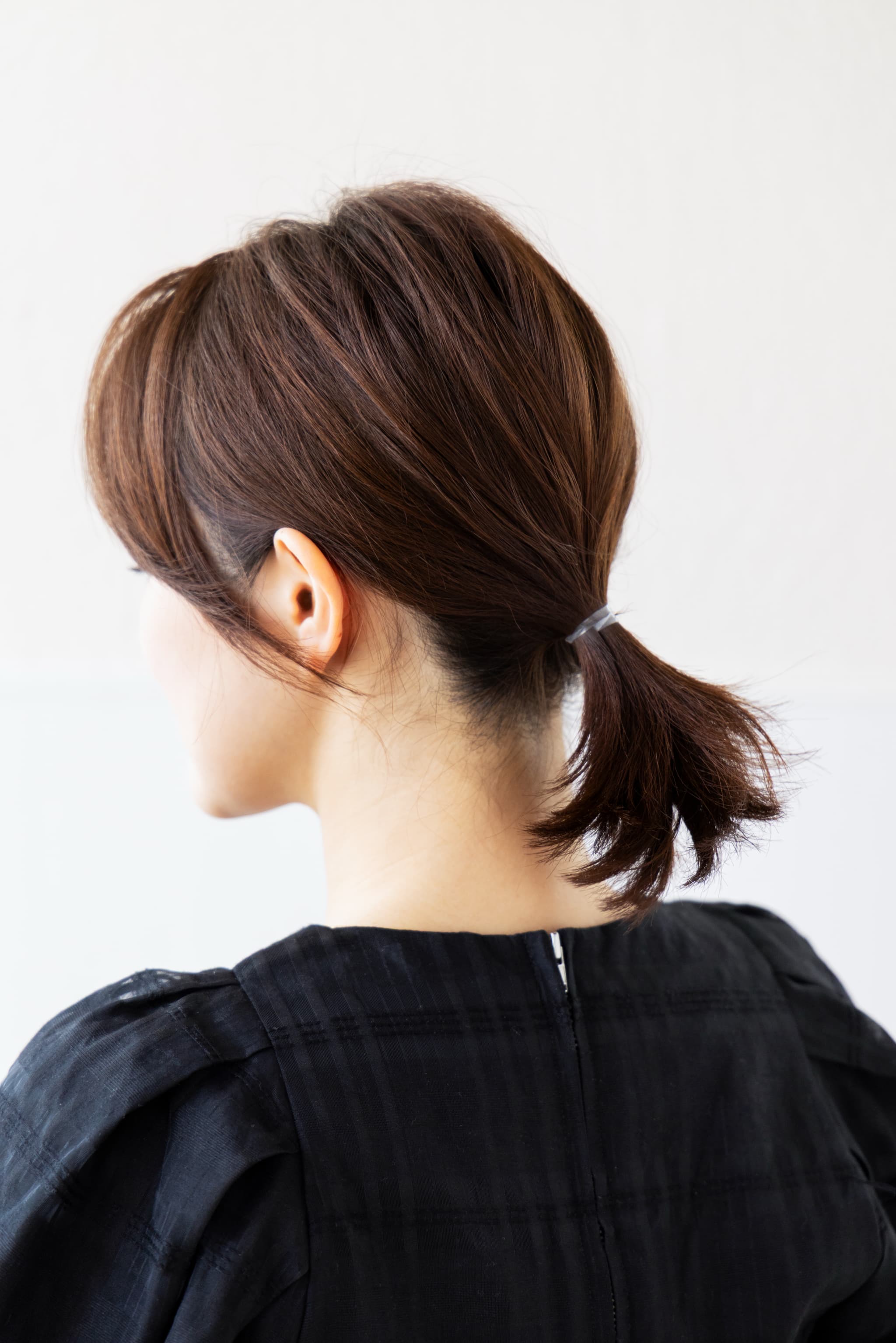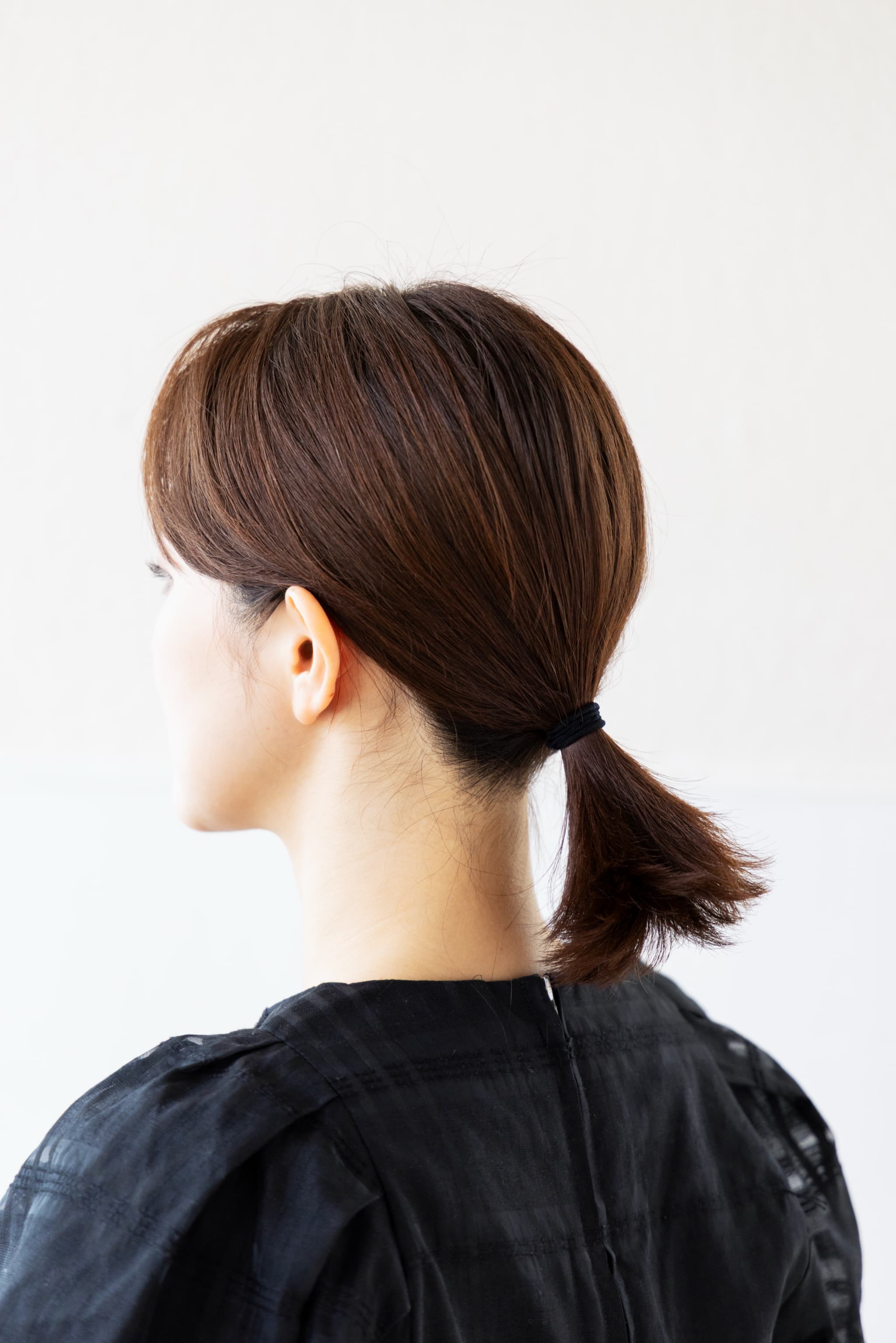 顔回りのアクセントになる耳前の髪を残しておきます。後ろの髪を衿足くらいの低めでまとめてひとつ結びに。