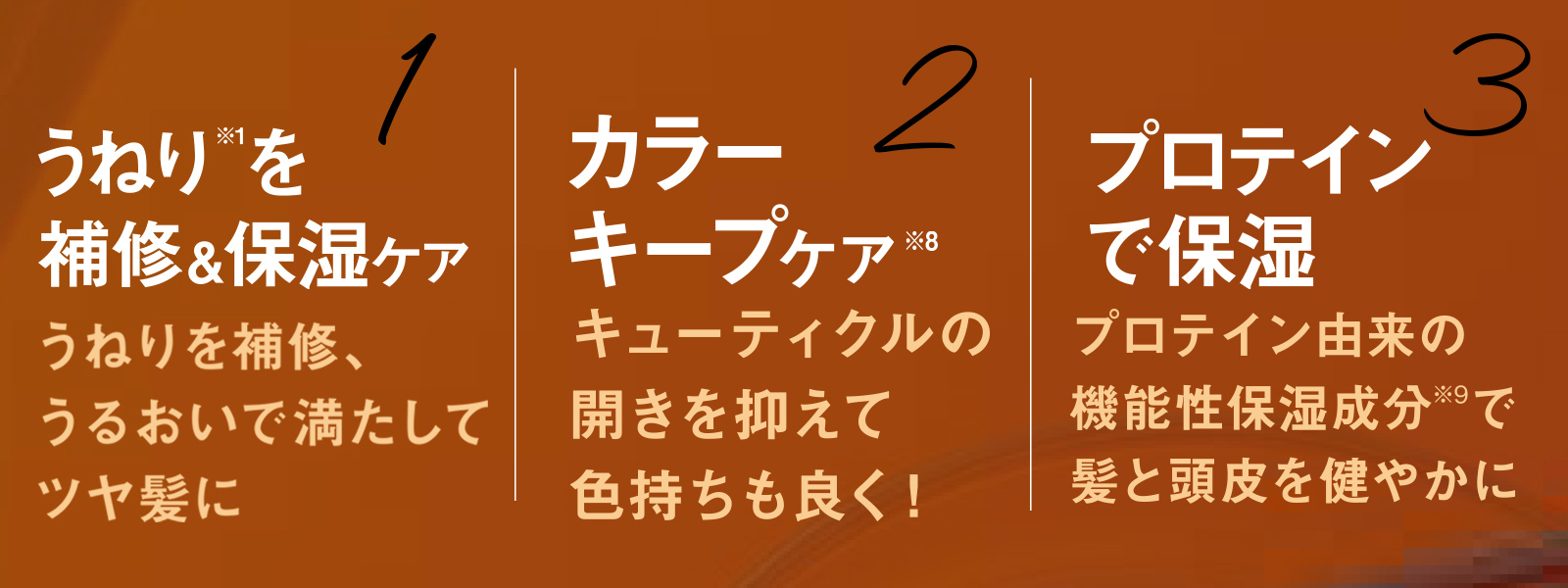 ダメージによりうねった髪にプロテインチャージ。髪の芯と表面にアプローチしてうねりを補修&うるおいで満たす保湿ケア。健やかな髪のためにプロテイン由来の機能性保湿成分も配合。ジアミン系酸化染料を含む6つのフリー処方※10にもこだわりました。