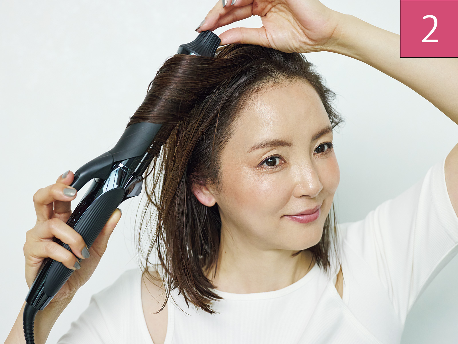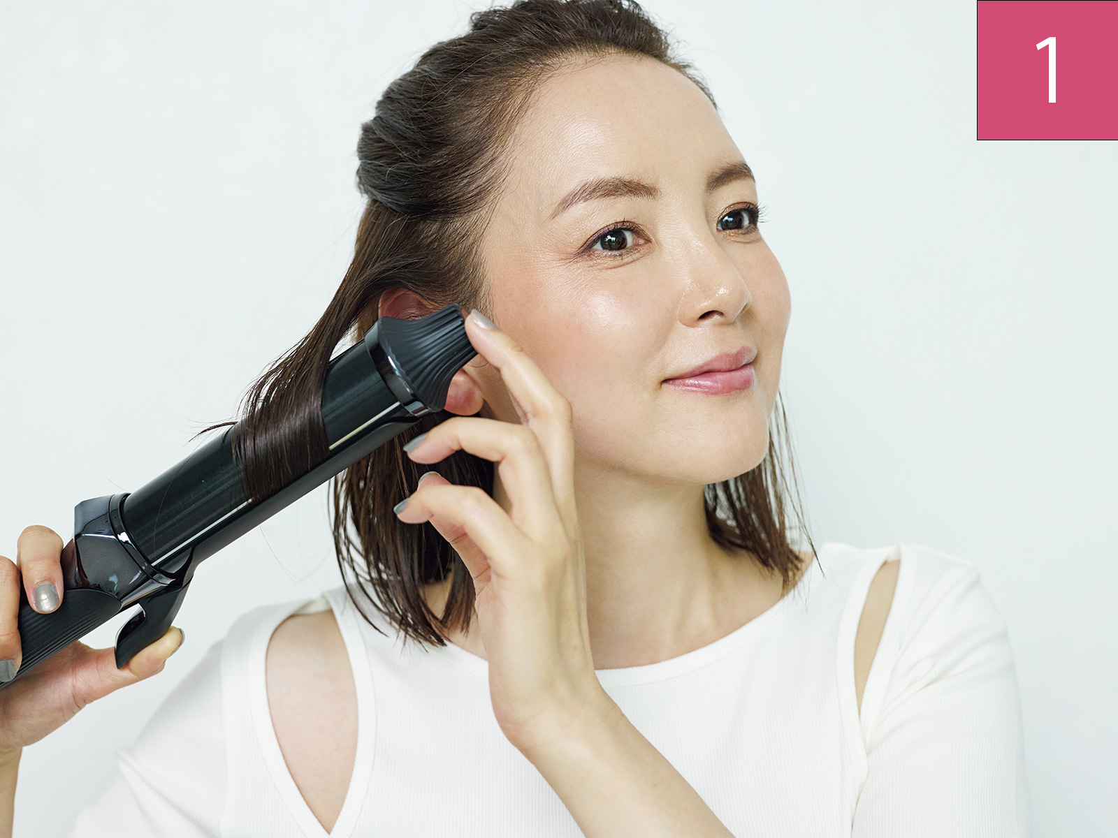 38mmくらいの太めのコテでざっくりと巻いてニュアンスをつけます。耳上と耳下の髪に分けて耳より上は外巻きに、耳より下は内巻きに。最後に髪全体に艶を出すスプレーをしたら完成です。ナチュラルなミックス巻きに。
