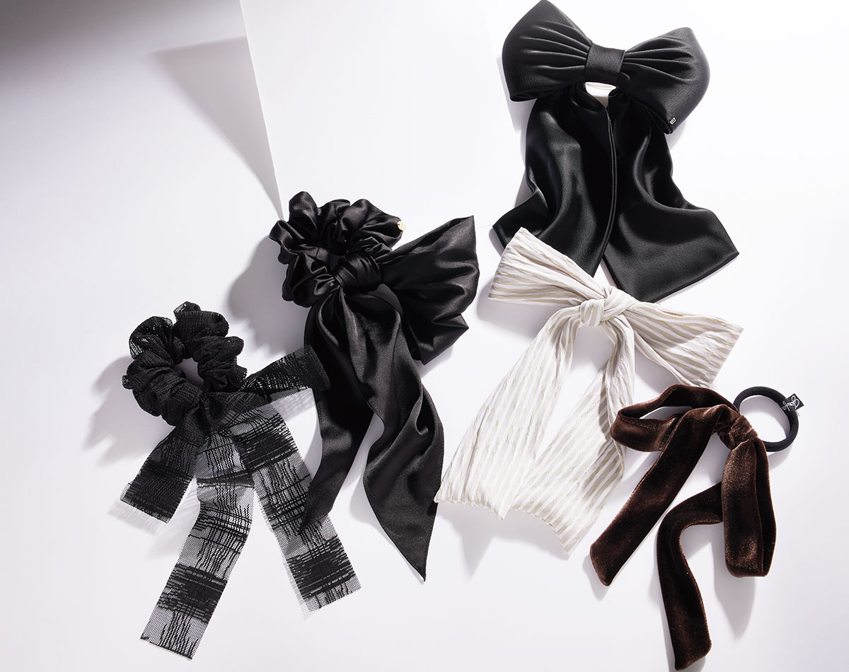 サイズや素材、つける位置でクールにもエレガントにも雰囲気自在な垂れ下がりリボン。湿気で髪が広がったときも、ボウが髪の毛にニュアンスをつけて、可愛く目くらましできて、ボリュームアップも叶う♪