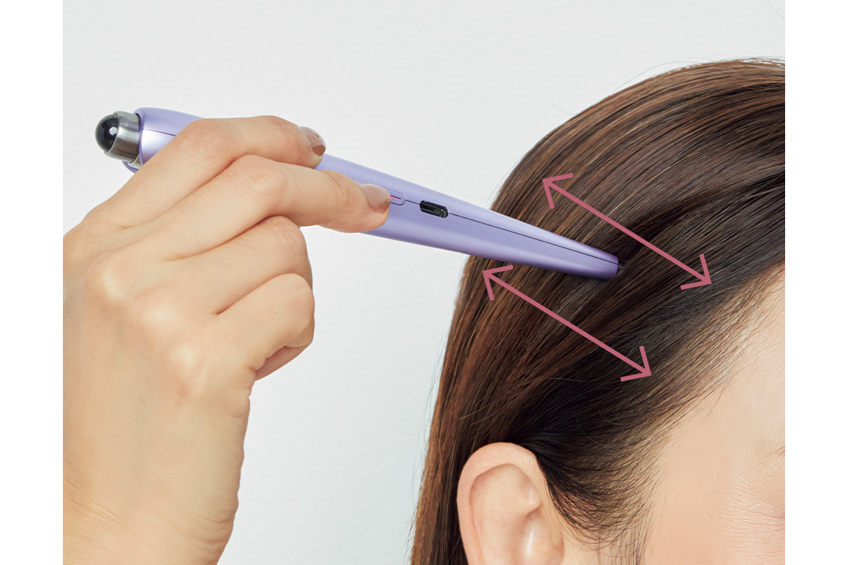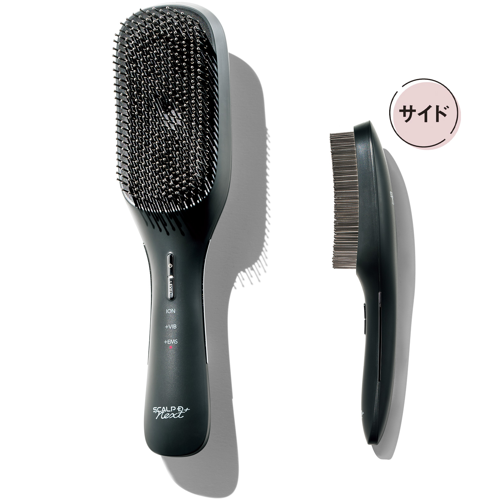 頭皮に沿うアーチ状のピンヘッドで、頭皮ケア・フェイスケア・ヘアケア・ヘアスタイリングもできる1台4役! 3段階のEMSで頭皮を引き締められるだけでなく、髪にはトリートメントイオン、髪・地肌・体をほぐすバイブレーションも搭載されたりと多機能。