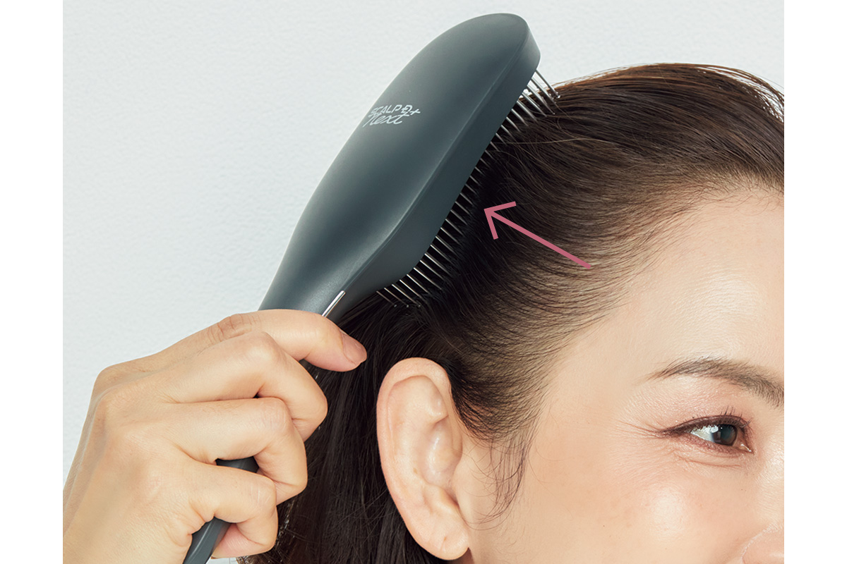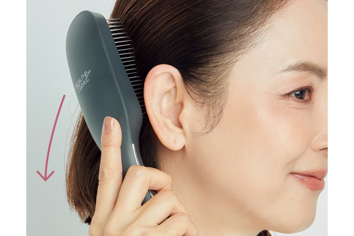 衿足から後頭部まで下から引き上げるようにブラシを通すと、顔を支えている側頭筋や後頭筋を刺激して、たるみレスに。