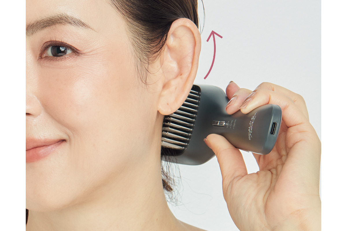 頰のハリを出すためには、実は頭皮ケアが肝心です。スカルプエッセンスで栄養を与え、優しく守りつつ頭皮を育てる。そして、ガジェットで頭皮の血流を巡らせて整えれば、一枚の皮膚で繫がる頰までグッと引き上がる!頭皮を慈しむことが効率の良いハリ作りの秘訣でした。