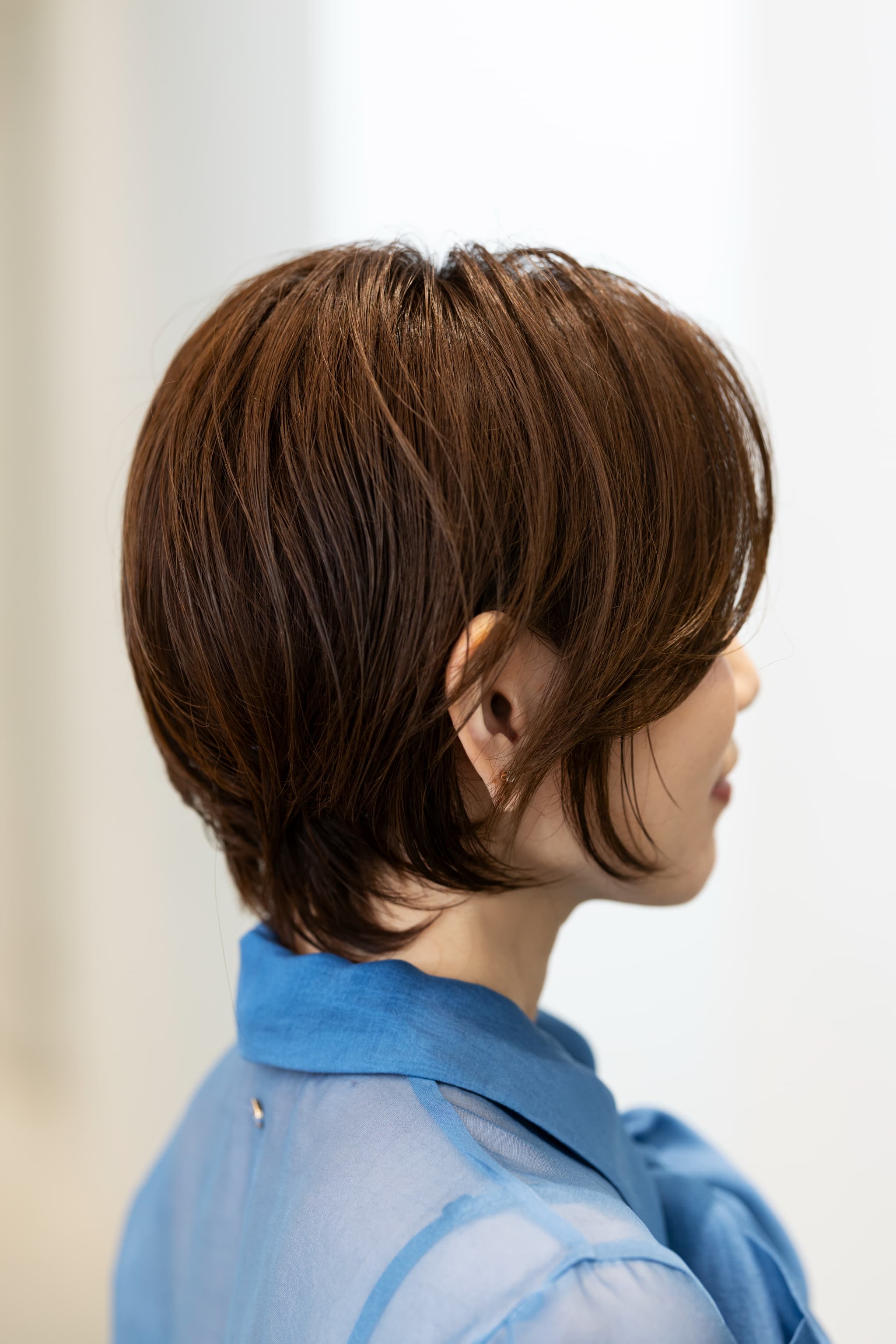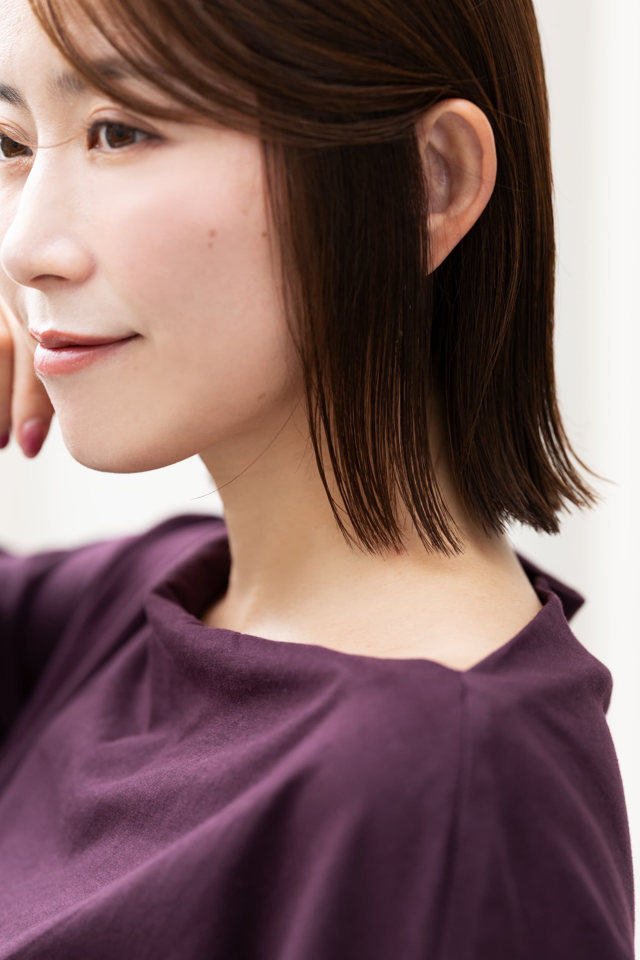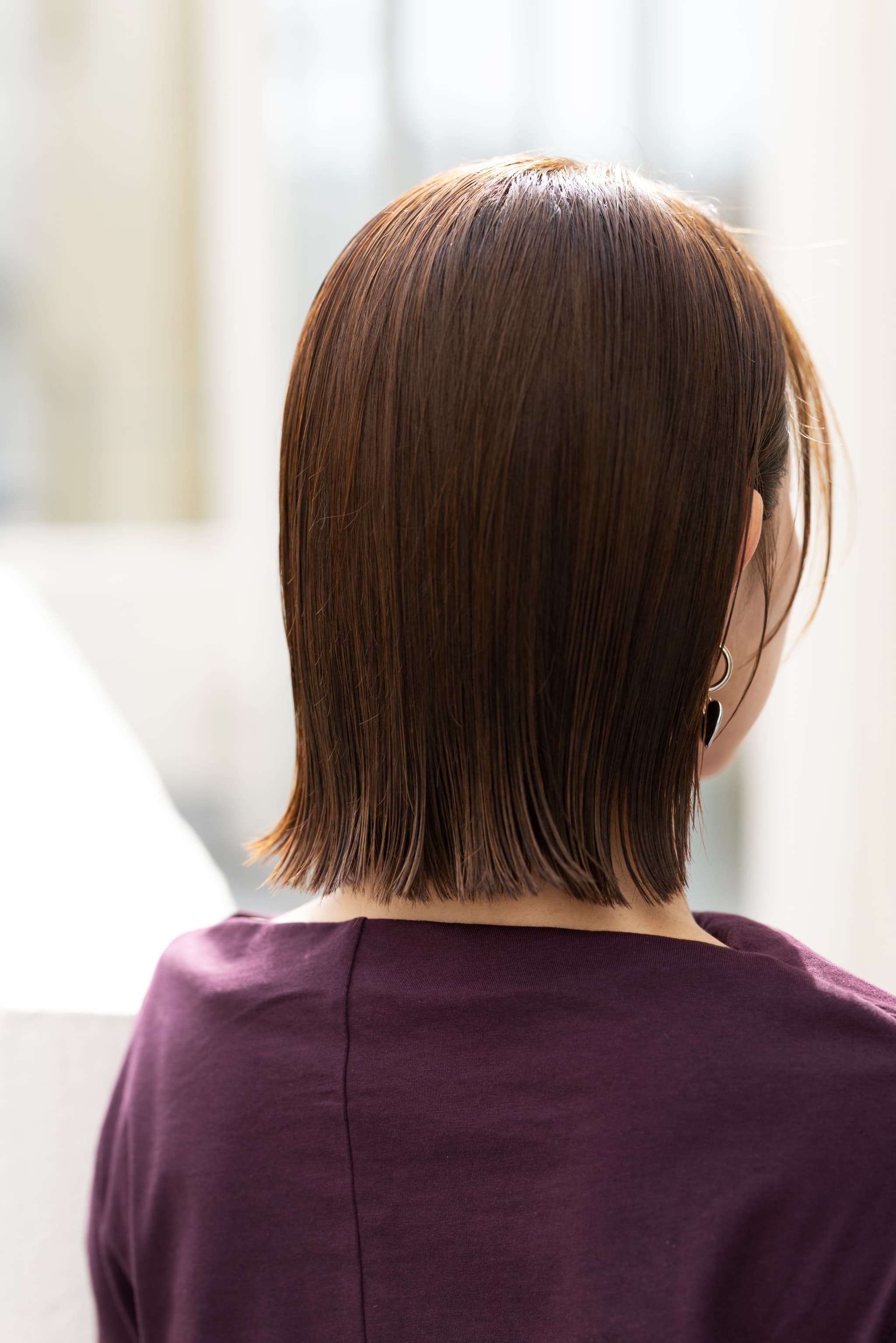 パサつきのない揃った毛先は、フェイスラインをすっきり見せる効果もあります。