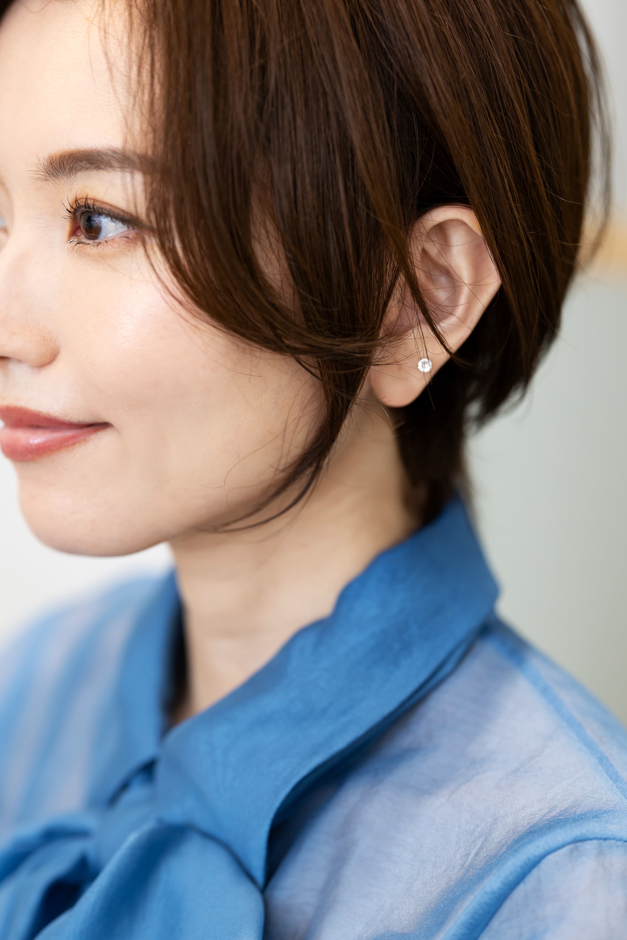 大きな内巻きの毛先が肩上でおさまり、丸いシルエットに仕上がった優しい印象のボブ。定番の外ハネはカジュアル過ぎるという人が、上品な”内巻き”にシフトしています。