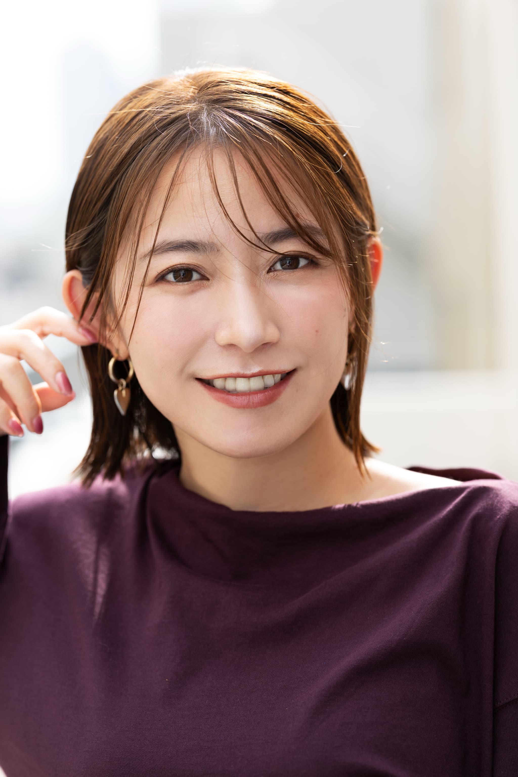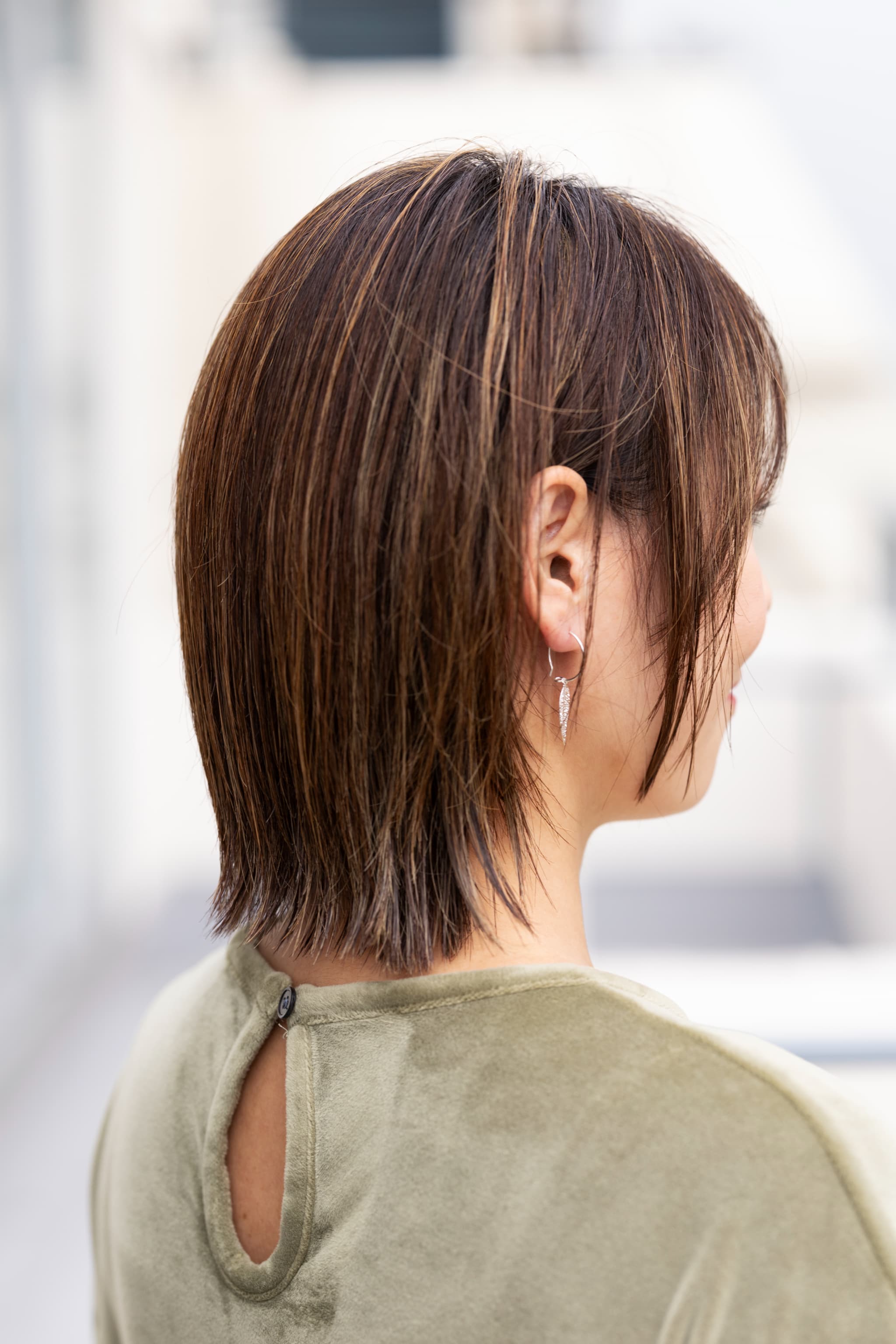 全体のフォルムは定番人気の外ハネボブですが、顔回りに入った高めのレイヤーが頬にかかっているのが特徴。首元が絞られ、毛先が頬を隠しているので小顔効果抜群です。