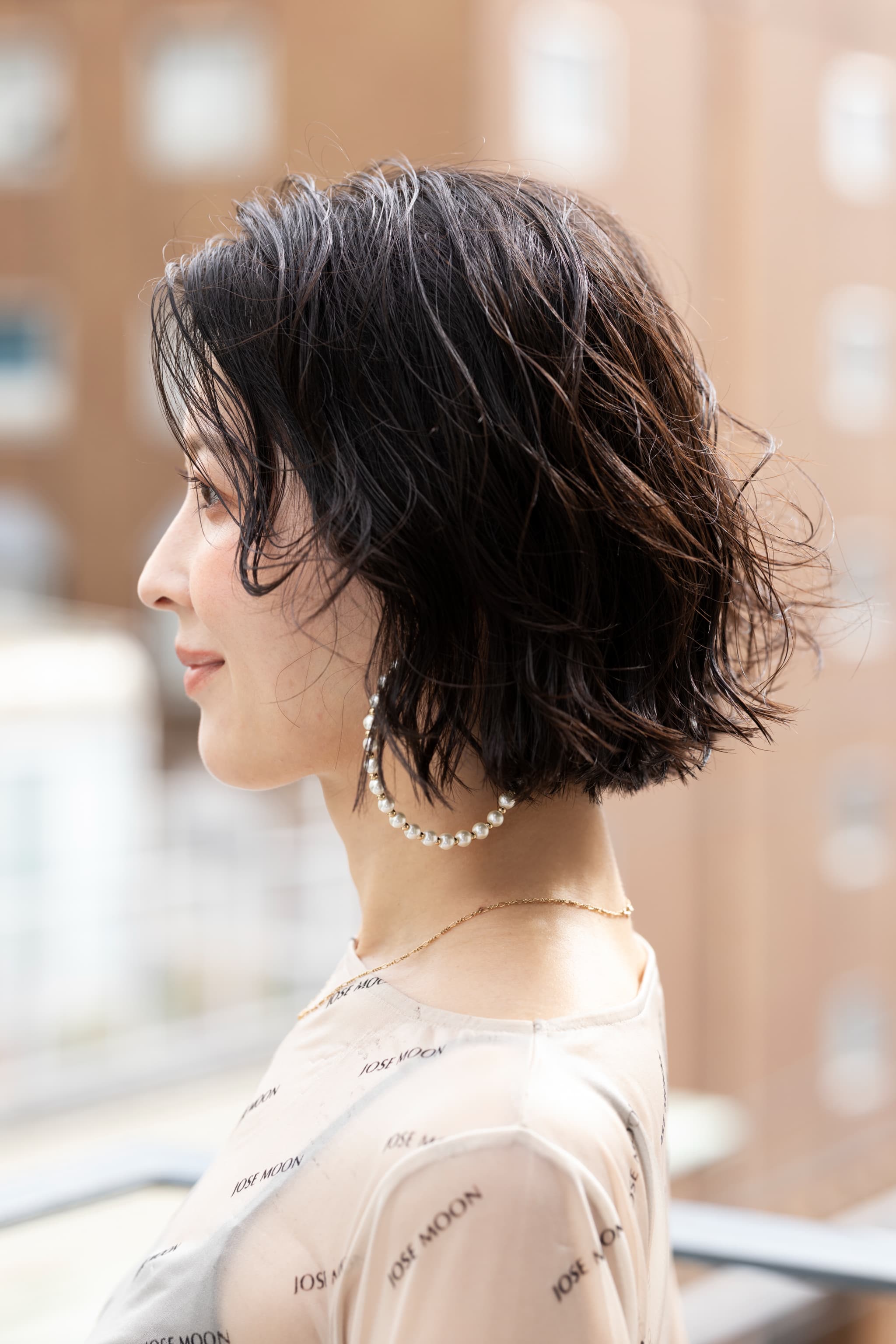 根元から毛先までウェーブしていることで、顔回りだけでなくトップもふんわり仕上がるのが特徴のボブ。暖かみを感じるカールなので、寒くなる秋冬に最適な質感です。