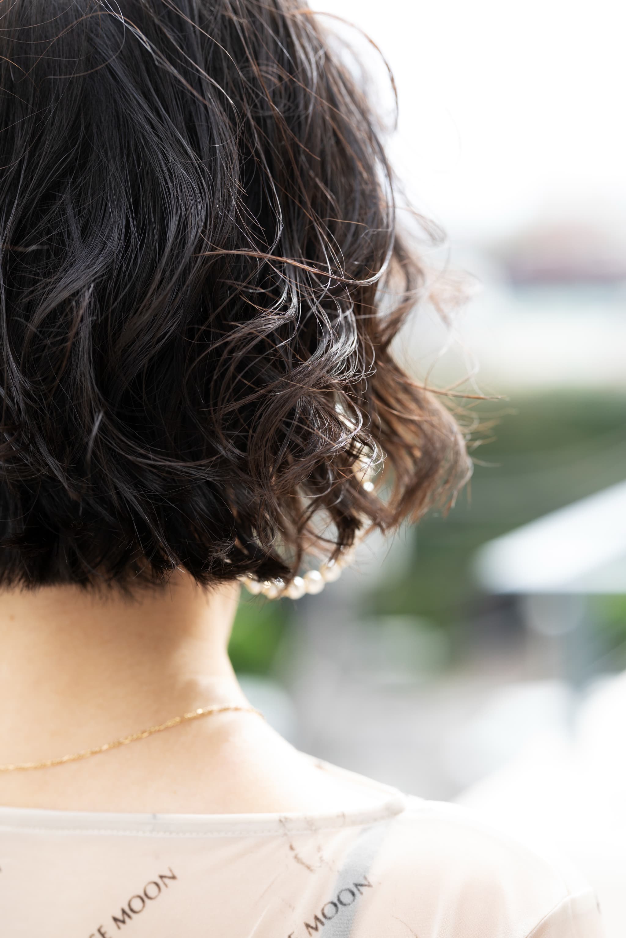 〈カット〉毛先が肩にかかると切りっぱなしのアウトラインが見えなくなるので、肩上1㎝でカット。毛先に厚みが残るようにレイヤーは入れませんが、後ろは厚みが出るので内側の髪を毛量調整。前髪は薄く長めに作って透けバングに。