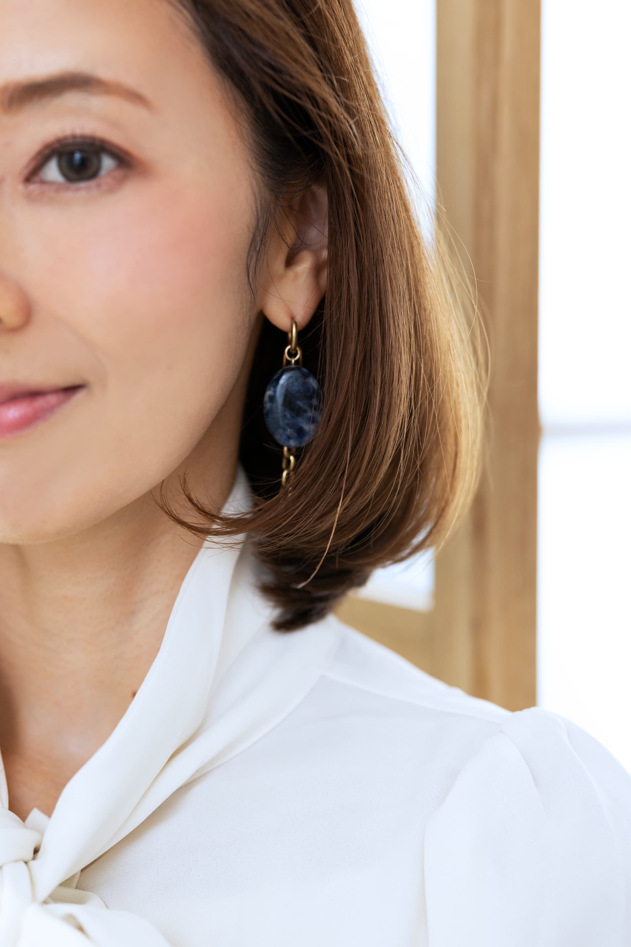 内巻きした髪が頬の横に厚みを作ってくれるので、痩せた顔回りがふっくらした印象になります。