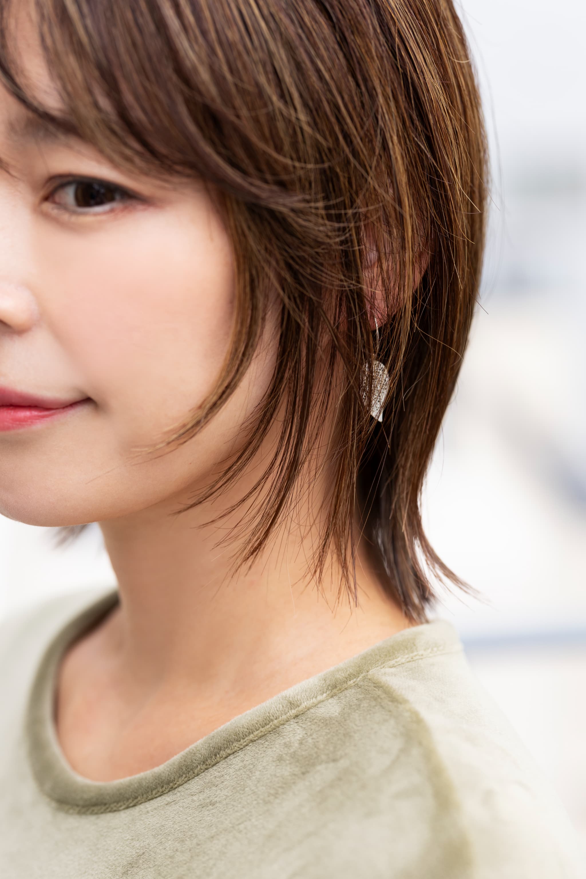 顔回りに入れたレイヤーの毛先が頬にかかり、もたついたフェイスラインを隠してくれます。