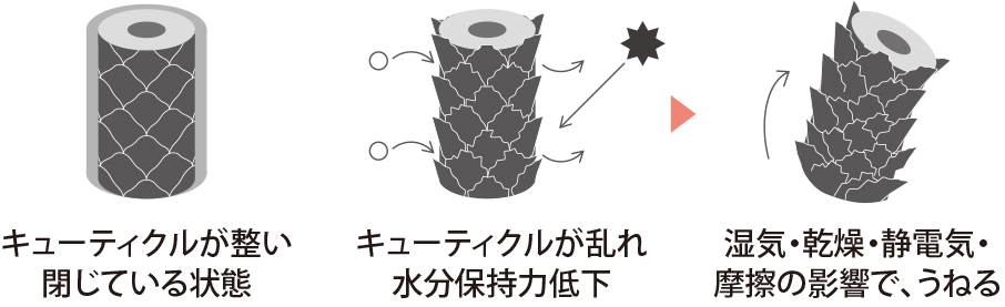エイジングした髪はキューティクルが浮き、乾燥状態。ツヤが失われて、湿度の変化や静電気による影響を受けやすくうねってしまいます。ヘアミルクを1回使用すると、キューティクルがキュッと閉じてなめらかに整いツヤもアップ!